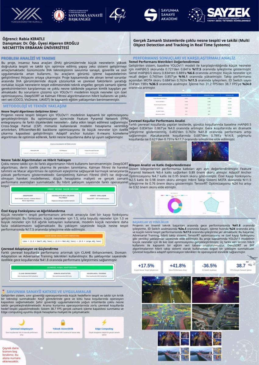 Bölümümüz öğrencilerinden Rabia KIRATLI, Savunma Sanayii Yapay Zeka Yetenek Kümelenmesi (SAYZEK)-ATP 2024-2025 programında önemli bir başarıya imza attı. Öğrencimiz, "Gerçek zamanlı sistemlerdeki Çoklu Nesne Tespiti ve Takibi" başlıklı konuda geliştirdiği projesiyle konu birincisi olarak yer almış ve bu başarısı sonucunda HAVELSAN'da staj imkanı ödülünü kazanmıştır. Aselsan Gölbaşı Yerleşkesi’nde gerçekleşen "Tezden Teknolojiye: Final Buluşması"nda sunulan bu çalışma, savunma sanayii paydaşlarından yoğun ilgi görmüştür. Ayrıca, bu projenin çıktıları, danışman hocası Dr. Öğr. Üyesi Alperen Eroğlu ile birlikte hazırlanan, "Real-time multi-object detection and tracking in UAV systems: improved YOLOv11-EFAC and optimized tracking algorithms" başlıklı makale ile taçlanmış; makale, SCI-Expanded (Q2) ve Scopus (Q1) indekslerinde taranan bir dergi olan Journal of Real-Time Image Processing'de yayınlanmıştır Öğrencimizi tebrik eder, başarılarının devamını dileriz.