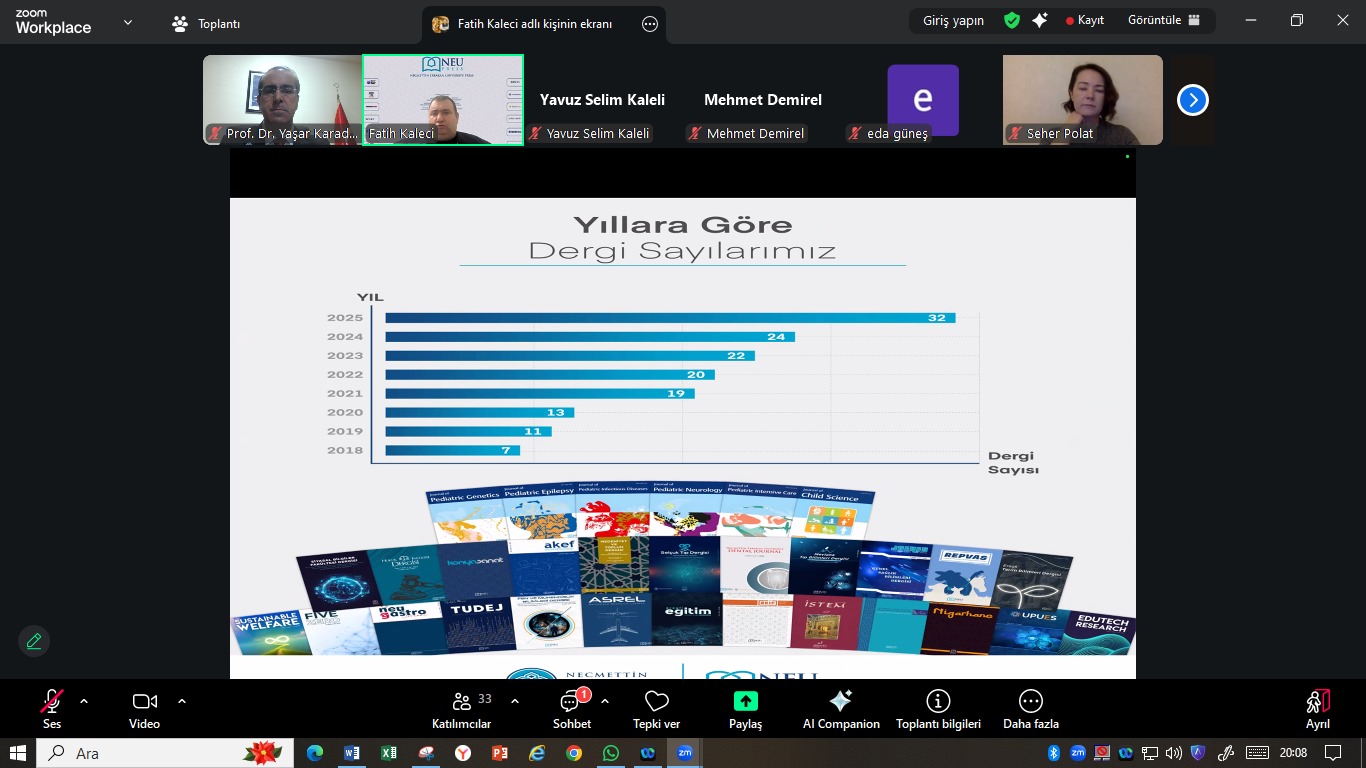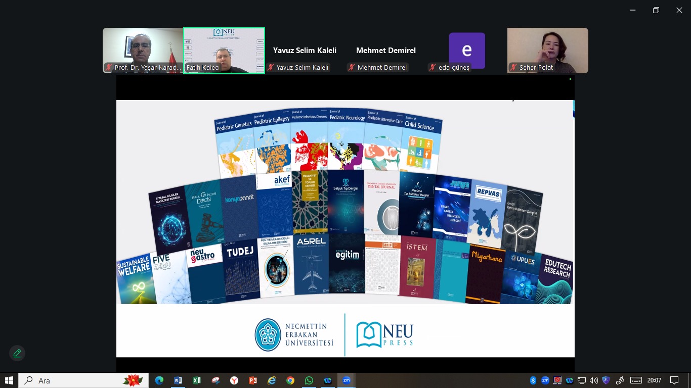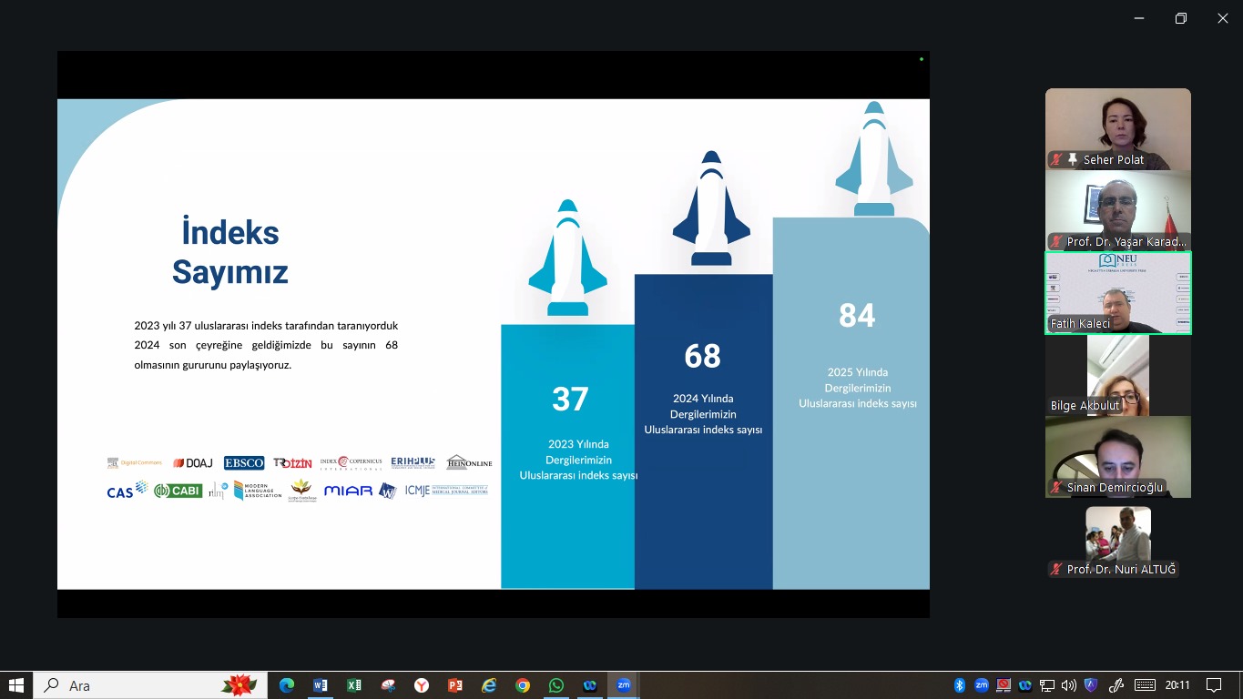 Necmettin Erbakan Üniversitesi (NEÜ) Bilimsel Yayınlar Koordinatörlüğü tarafından geleneksel olarak düzenlenen Yıl Sonu Dergi Değerlendirme Toplantısı, çevrim içi ortamda gerçekleştirildi. Toplantıda, üniversite bünyesinde yayımlanan ulusal ve uluslararası olmak üzere toplam 32 akademik derginin yayın süreçleri, yayın periyotlarına uyum durumları, verimlilik düzeyleri ile indekslenme süreçleri ve mevcut indeks performansları kapsamlı biçimde ele alındı. Bilimsel Yayınlar Koordinatörü Dr. Öğr. Üyesi Fatih Kaleci’nin başkanlığında gerçekleştirilen toplantıya, üniversitenin çeşitli fakültelerine bağlı akademik dergilerin editörleri ve editoryal sürece katkı sağlayan hocalarımız katılım sağladı. Toplantıda, dergilerin belirlenen yayın periyotlarına uygun şekilde düzenli yayımlanmasının, akademik kalite, sürdürülebilirlik ve ulusal-uluslararası görünürlük açısından taşıdığı önem vurgulandı. Toplantı kapsamında; dergilerin genel durumu ve hedefleri, YÖK’ün yeni vizyonu, atama ve yükseltme yönetmeliği uygulamaları, indekslerdeki son durum, ESCI ve SCOPUS iş birlikleri, TR Dizin ve DergiPark iş birlikleri, Bilimsel Yayınlar Koordinatörlüğü ekibi tarafından gerçekleştirilen faaliyetler, yeni kurulan dergiler, özel sayı planlamaları, bilimsel yayıncılığa ilişkin yürütülen çalışmalar ve akademik yayıncılıkta güncel gelişmeler kapsamlı şekilde ele alındı. Toplantı, soru-cevap bölümünün ardından sona erdi. Toplantıya katılım gösteren, Bilimsel Yayınlar Koordinatörlüğü ekibi ve editöryal sürece dâhil olan hocalarımız üniversite bünyesindeki akademik dergilerin düzenli, nitelikli ve sürdürülebilir biçimde yayımlanmasını kurumsal bir öncelik olarak benimseyerek çalışmalarını sürdürmeye devam etmektedir.