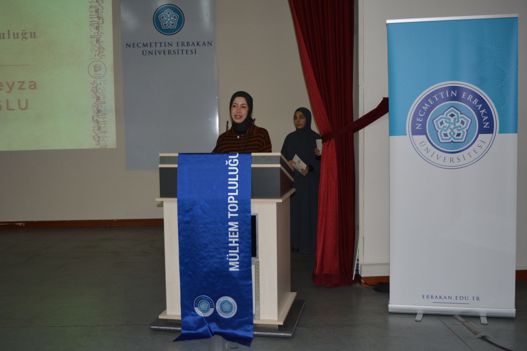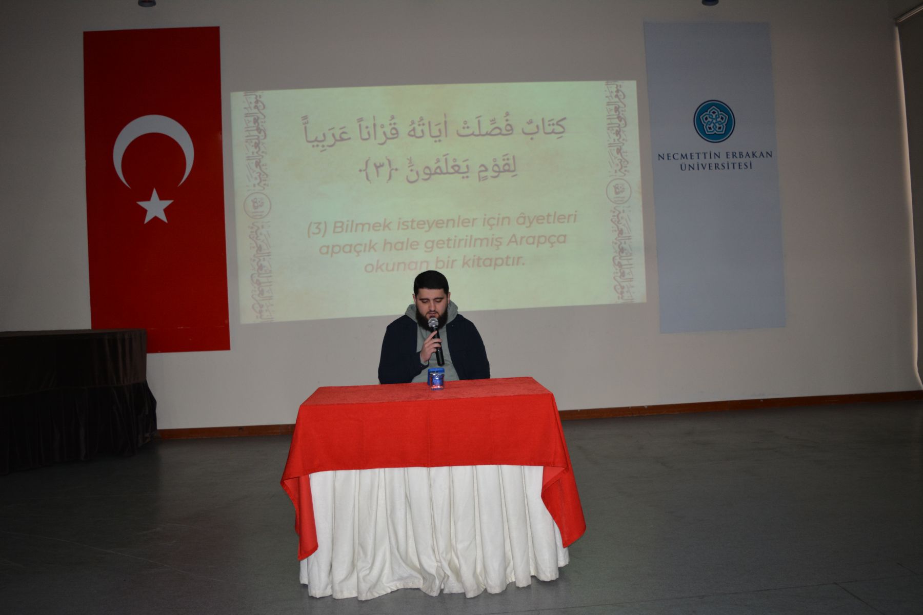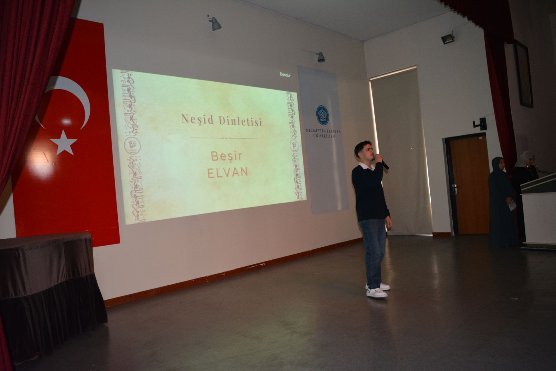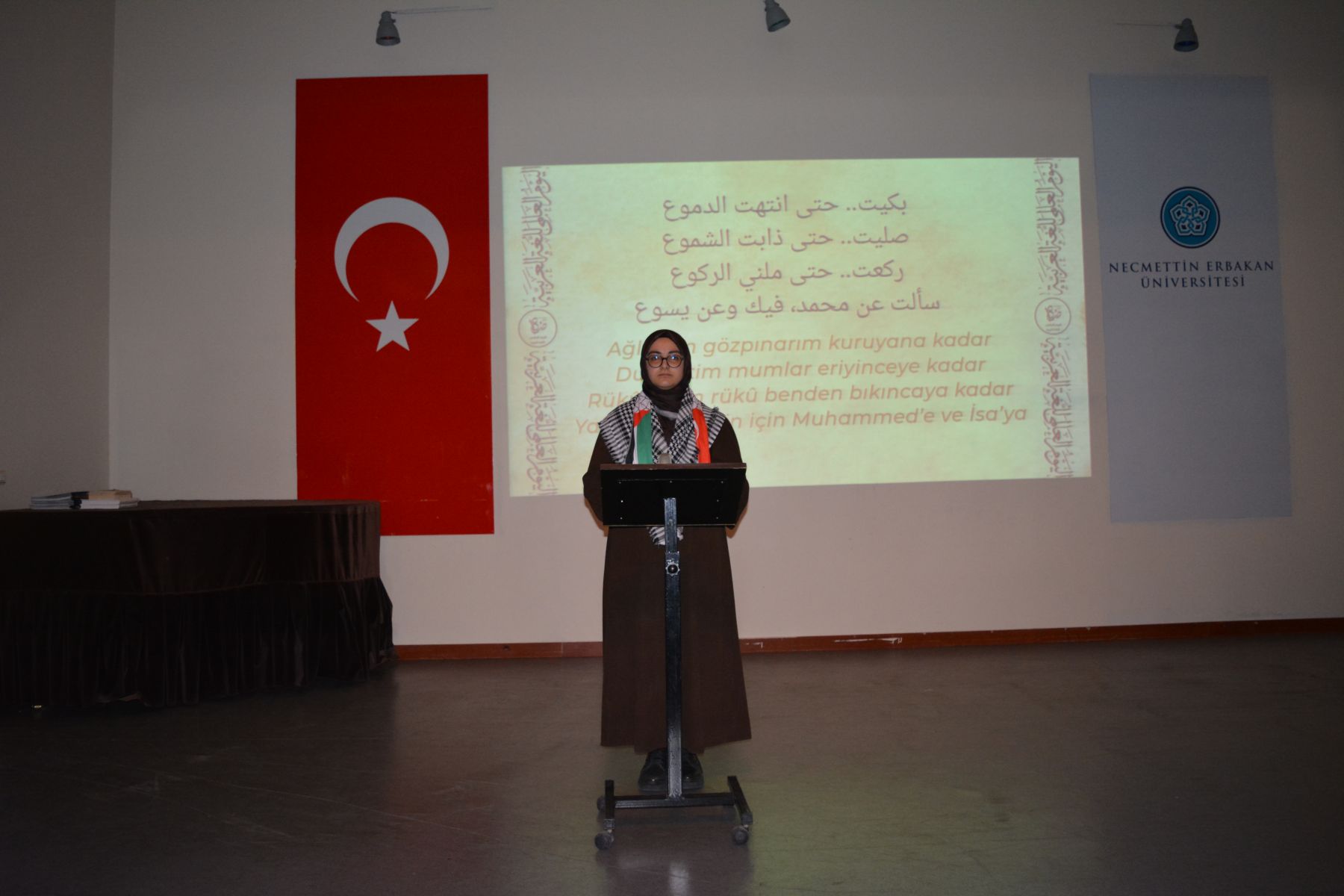 Kur’an-ı Kerim tilaveti ile başlayan programda, Arap Dili Eğitimi Bölüm Başkanı Doç. Dr. Ahmet Yıldız ile Mülhem Topluluğu Başkanı Nimet Beyza Kurtoğlu birer konuşma gerçekleştirdi. Programda ayrıca günün anlam ve önemini belirten Sümeyye Başoda’nın konuşmasının yanı sıra şiir dinletisi, tekerlemeler, Neşit dinletisi ve birçok etkinlik yer aldı.
