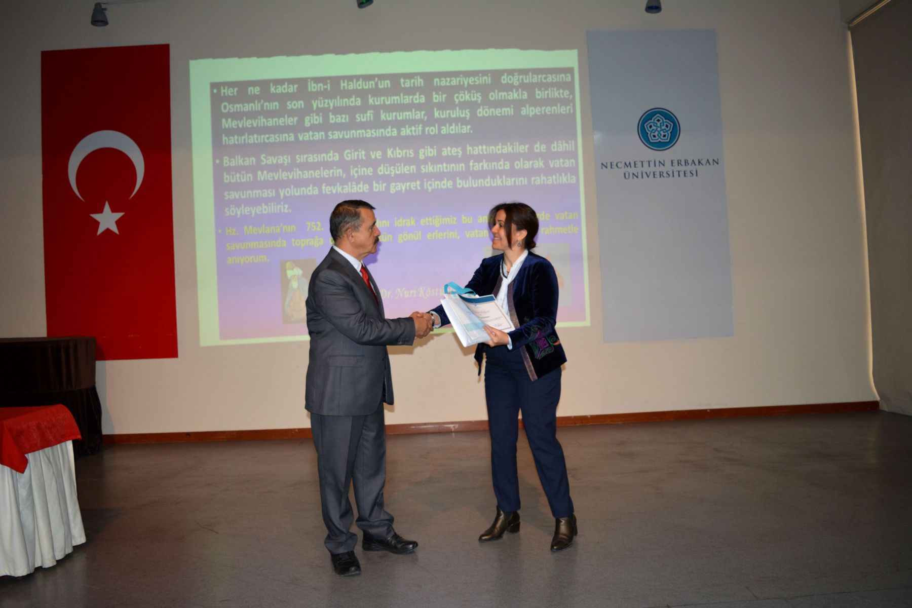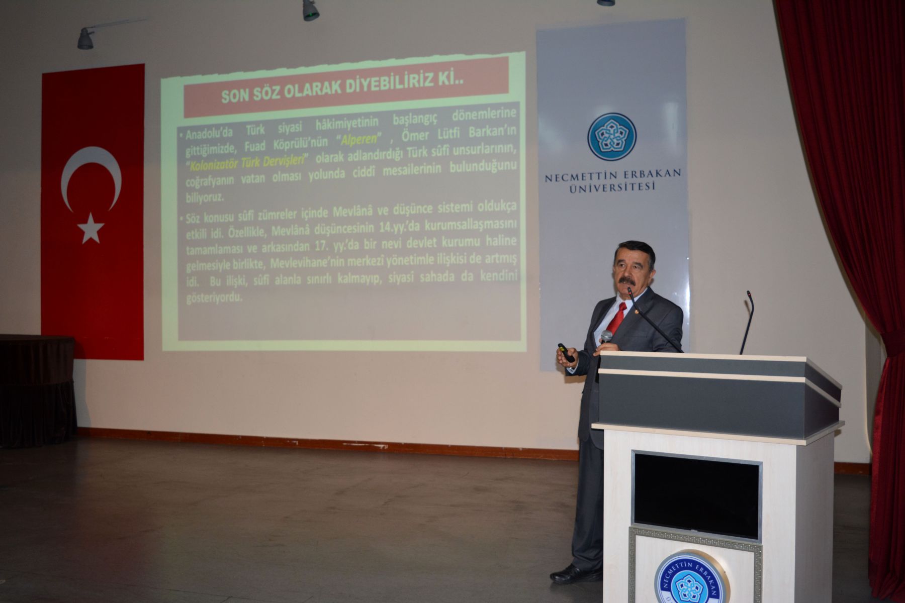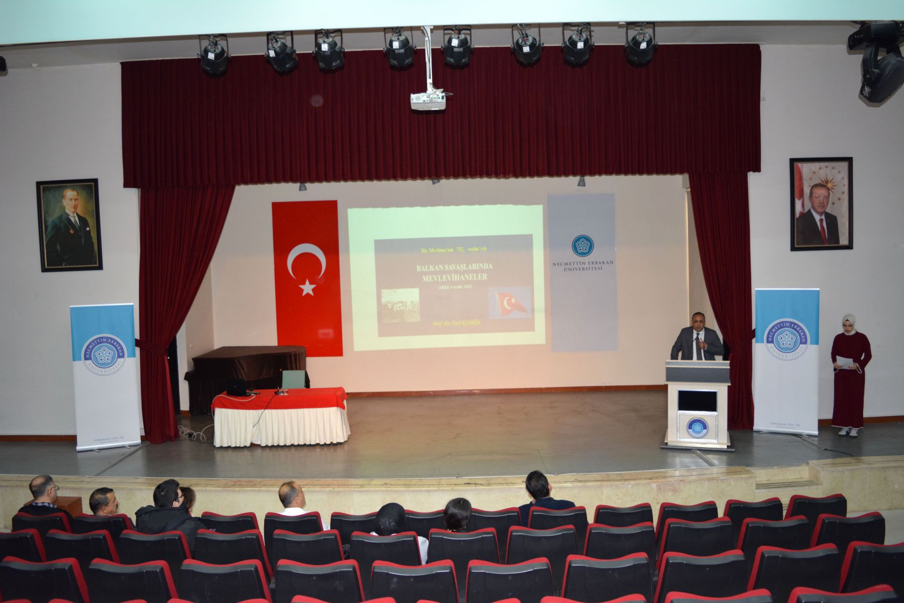 Fakültemizde"Balkan Savaşlarında Mevlevihaneler" konulu konferans Prof.Dr.Erol Güngör konferans salonunda gerçekleşmiştir. Fakülte yönetimi, akademisyenler ve çok sayıda öğrencinin dinleyici olarak katıldığı “Balkan Savaşları’nda Mevlevihaneler” konulu konferansında Prof. Dr. Nuri KÖSTÜKLÜ, özetle şu hususlara temas etti; Emperyalist Batı dünyasının 1815’ Viyana Konferansında “şark meselesi” olarak adlandırdıkları ve sonuç itibarıyla Anadolu’da Türk-İslam hâkimiyetine son vermeyi amaçlayan politikanın safhalarından birisi de Balkan Savaşları idi. Aslında bir Balkan devleti olan Osmanlı Devletini tamamen Balkanlardan sürmeyi amaçlayan bu savaş sürecinde diğer bazı sufî kurumlar gibi Mevlevihanelerin de “vatanı savunma” sorumluluğuna girdiklerini görüyoruz. Osmanlı’nın son yüzyılında, İbni Haldun’un “tarih nazariyesini” doğrularcasına kurumlarda çöküş emareleri görülüyordu. Mevlevihane ve diğer sûfî müesseseler de bu değerlendirmenin dışında bulunmuyorlardı. Ancak vâkıa bu iken, burada hatırlamamız gereken bir sosyolojik kâideyi de ifade etmek durumundayız; o da “köklü ve tarihî müesseseler ne kadar muattal ve işe yaramaz hale gelirlerse gelsinler, müessesenin idare ve yöneticileri eskiye göre ne kadar pasif duruma düşerlerse düşsünler, önceki ruh ve faaliyetlerinden hemen uzaklaşamama” gerçeği idi. Nitekim, artık ömürlerini tamamladı diye düşündüğümüz bazı köklü müesseseler gibi, Mevlevihanelerin de; Türkler’in Balkanlar’dan ve arkasından Anadolu’dan tasfiyesi için düğmeye basıldığı Balkan Savaşları’ndan itibaren bu kuralı ispatlarcasına; kuruluş dönemindeki Fuad Köprülü’nün ifadesi ile “alperenler”, “gaziyân-ı Rum”, “abdalan-ı Rum” zümrelerini, Ömer Lütfi Barkan’ın deyimiyle “kolonizatör Türk dervişlerini” hatırlatırcasına bir faaliyet içinde bulunduklarını rahatlıkla söyleyebiliriz. Mevlevihaneler, Balkan Savaşı sırasında çeşitli lojistik destek faaliyetlerinde bulundular. Yenikapı Mevlevihanesi’nin Balkan yaralıları için hastaneye dönüştürülmesi, Galata Mevlevihanesi’nin ilaç vb. yardımların toplama merkezi haline getirilmesi planlandı. Bu konuda; Ankara, Çankırı, Afyon, Maraş, Urfa, Bursa, Konya, Amasya, Kütahya ve daha ismini sayamadığımız Anadolu’daki pek çok Mevlevihane, seferber oldu. Adeta maddi- manevi yarış içine girdiler. Bunun da ötesinde Bursa ve Maraş Mevlevileri örneklerinde görüleceği üzere bizzat savaşa gitmeye hazır oldukları iradesini ortaya koydular. Bu günlerde bizzat kendileri ateş hattında bulunmalarına rağmen Girit Hanya ve Kıbrıs Lefkoşe Mevlevihaneleri, vatan savunması yolunda fevkalâde bir gayret içinde bulundular. Bir taraftan bulundukları yeri terk etmeme iradesini ortaya koyarken bir taraftan da Balkan yaralılarına yardım için seferber oldular. Mevlevihaneler yardımların yanısıra; Balkan coğrafyasında Müslümanlara- Türklere yapılan zulüm ve işkenceler karşısında da kayıtsız kalmadılar. İlgili makamlara gönderdikleri protesto namelerle tepkilerini ortaya koydular. Devede kulak misalı 2. Balkan Savaşı’nda Edirne ve Kırklareli’nin yeniden vatan sınırları içine alınmasını adeta sevinç çığlıklarıyla kutladılar. Tani bu savaş sürecinde acılara da sevinçlere de ortak oldular. Hz. Mevlana’nın 752. vuslat yılını idrak ettiğimiz bu anlamlı günlerde vatan savunmasında toprağa düşmüş bütün gönül erlerini, vatan evlatlarını rahmetle, şükranla anıyorum.