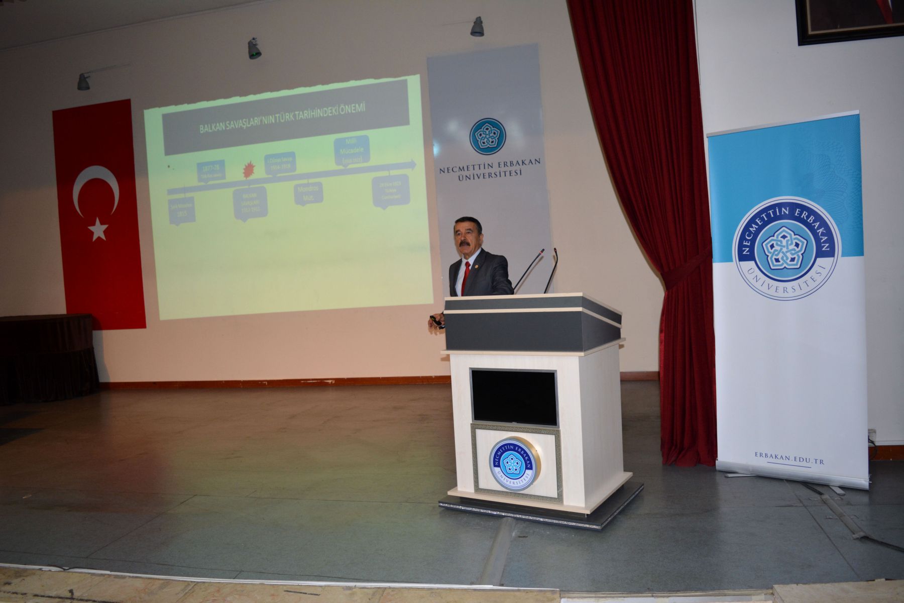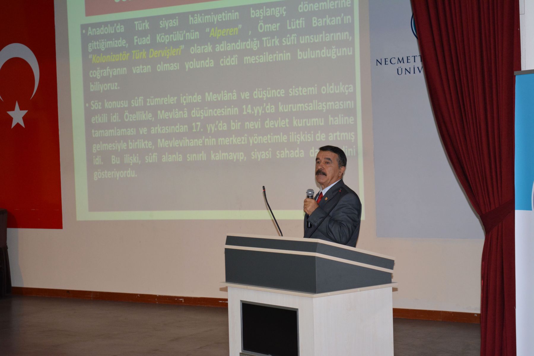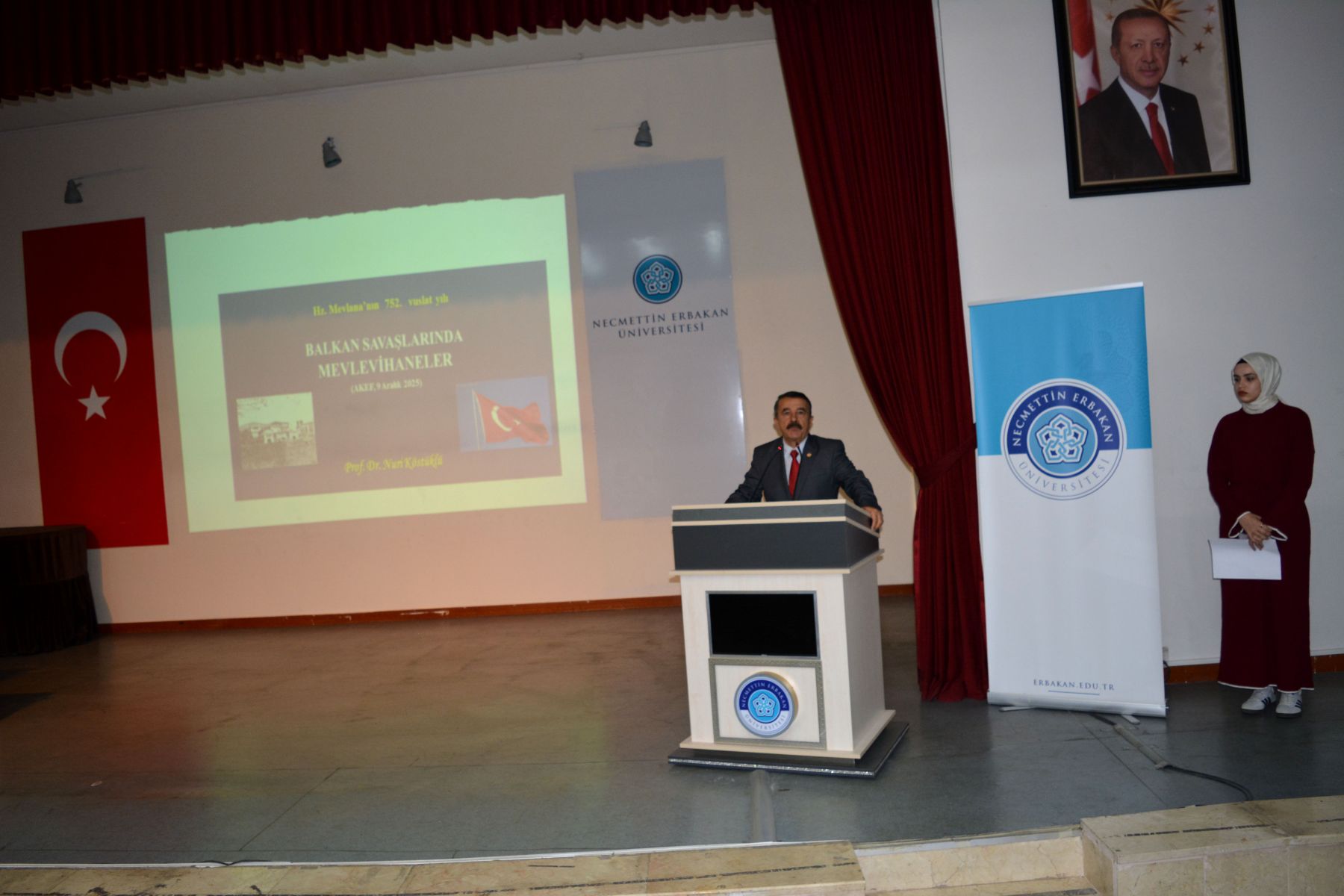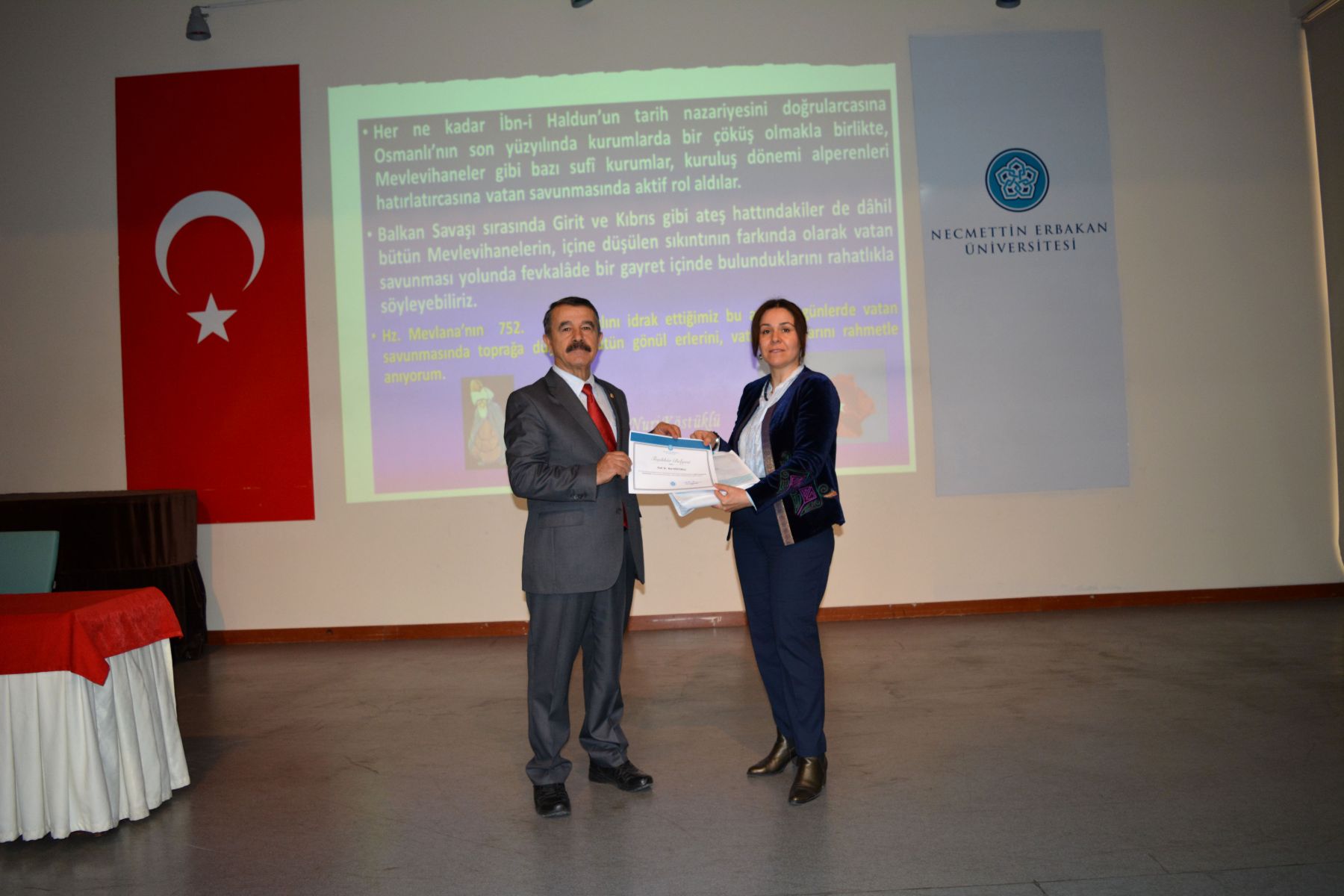 Fakültemizde"Balkan Savaşlarında Mevlevihaneler" konulu konferans Prof.Dr.Erol Güngör konferans salonunda gerçekleşmiştir. Fakülte yönetimi, akademisyenler ve çok sayıda öğrencinin dinleyici olarak katıldığı “Balkan Savaşları’nda Mevlevihaneler” konulu konferansında Prof. Dr. Nuri KÖSTÜKLÜ, özetle şu hususlara temas etti; Emperyalist Batı dünyasının 1815’ Viyana Konferansında “şark meselesi” olarak adlandırdıkları ve sonuç itibarıyla Anadolu’da Türk-İslam hâkimiyetine son vermeyi amaçlayan politikanın safhalarından birisi de Balkan Savaşları idi. Aslında bir Balkan devleti olan Osmanlı Devletini tamamen Balkanlardan sürmeyi amaçlayan bu savaş sürecinde diğer bazı sufî kurumlar gibi Mevlevihanelerin de “vatanı savunma” sorumluluğuna girdiklerini görüyoruz. Osmanlı’nın son yüzyılında, İbni Haldun’un “tarih nazariyesini” doğrularcasına kurumlarda çöküş emareleri görülüyordu. Mevlevihane ve diğer sûfî müesseseler de bu değerlendirmenin dışında bulunmuyorlardı. Ancak vâkıa bu iken, burada hatırlamamız gereken bir sosyolojik kâideyi de ifade etmek durumundayız; o da “köklü ve tarihî müesseseler ne kadar muattal ve işe yaramaz hale gelirlerse gelsinler, müessesenin idare ve yöneticileri eskiye göre ne kadar pasif duruma düşerlerse düşsünler, önceki ruh ve faaliyetlerinden hemen uzaklaşamama” gerçeği idi. Nitekim, artık ömürlerini tamamladı diye düşündüğümüz bazı köklü müesseseler gibi, Mevlevihanelerin de; Türkler’in Balkanlar’dan ve arkasından Anadolu’dan tasfiyesi için düğmeye basıldığı Balkan Savaşları’ndan itibaren bu kuralı ispatlarcasına; kuruluş dönemindeki Fuad Köprülü’nün ifadesi ile “alperenler”, “gaziyân-ı Rum”, “abdalan-ı Rum” zümrelerini, Ömer Lütfi Barkan’ın deyimiyle “kolonizatör Türk dervişlerini” hatırlatırcasına bir faaliyet içinde bulunduklarını rahatlıkla söyleyebiliriz. Mevlevihaneler, Balkan Savaşı sırasında çeşitli lojistik destek faaliyetlerinde bulundular. Yenikapı Mevlevihanesi’nin Balkan yaralıları için hastaneye dönüştürülmesi, Galata Mevlevihanesi’nin ilaç vb. yardımların toplama merkezi haline getirilmesi planlandı. Bu konuda; Ankara, Çankırı, Afyon, Maraş, Urfa, Bursa, Konya, Amasya, Kütahya ve daha ismini sayamadığımız Anadolu’daki pek çok Mevlevihane, seferber oldu. Adeta maddi- manevi yarış içine girdiler. Bunun da ötesinde Bursa ve Maraş Mevlevileri örneklerinde görüleceği üzere bizzat savaşa gitmeye hazır oldukları iradesini ortaya koydular. Bu günlerde bizzat kendileri ateş hattında bulunmalarına rağmen Girit Hanya ve Kıbrıs Lefkoşe Mevlevihaneleri, vatan savunması yolunda fevkalâde bir gayret içinde bulundular. Bir taraftan bulundukları yeri terk etmeme iradesini ortaya koyarken bir taraftan da Balkan yaralılarına yardım için seferber oldular. Mevlevihaneler yardımların yanısıra; Balkan coğrafyasında Müslümanlara- Türklere yapılan zulüm ve işkenceler karşısında da kayıtsız kalmadılar. İlgili makamlara gönderdikleri protesto namelerle tepkilerini ortaya koydular. Devede kulak misalı 2. Balkan Savaşı’nda Edirne ve Kırklareli’nin yeniden vatan sınırları içine alınmasını adeta sevinç çığlıklarıyla kutladılar. Tani bu savaş sürecinde acılara da sevinçlere de ortak oldular. Hz. Mevlana’nın 752. vuslat yılını idrak ettiğimiz bu anlamlı günlerde vatan savunmasında toprağa düşmüş bütün gönül erlerini, vatan evlatlarını rahmetle, şükranla anıyorum.