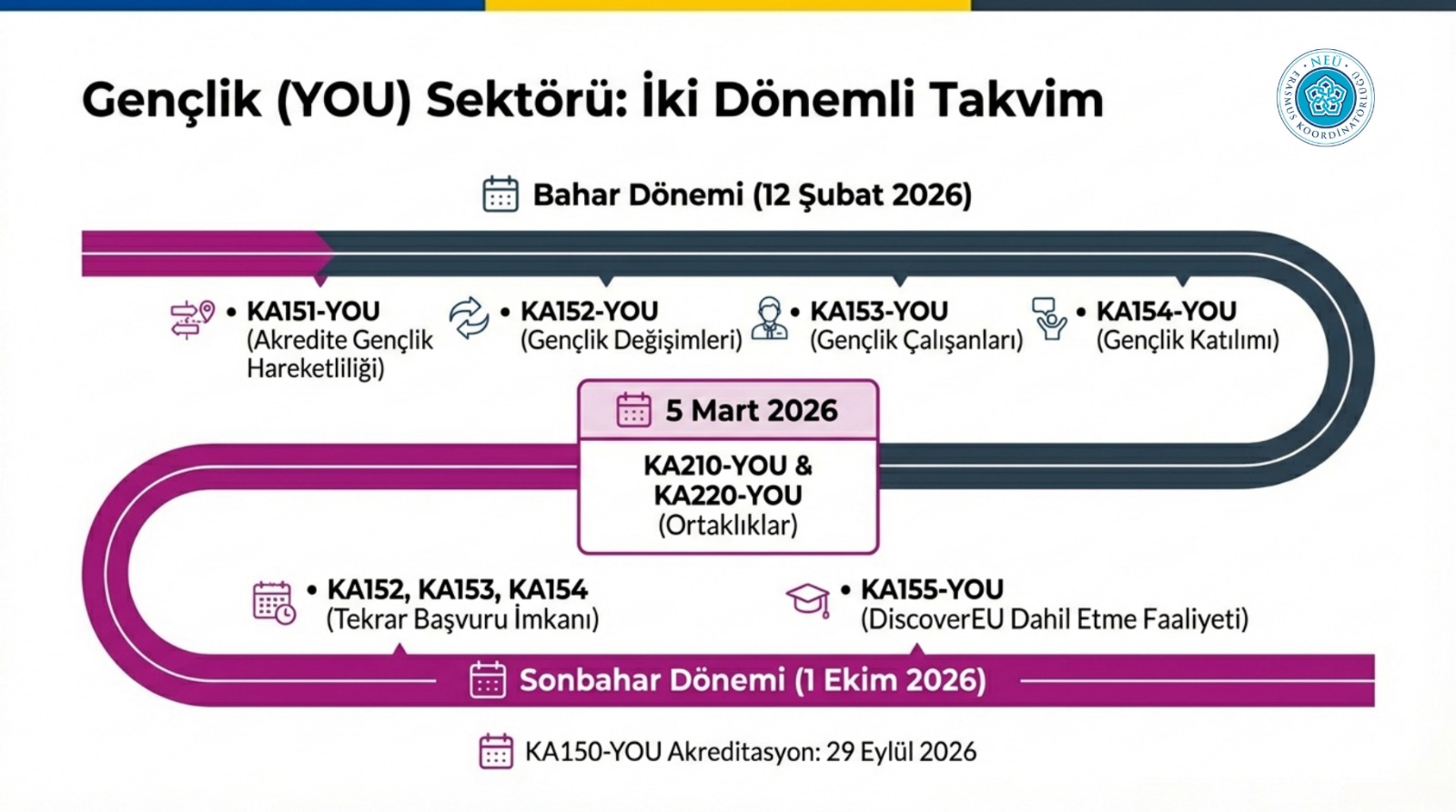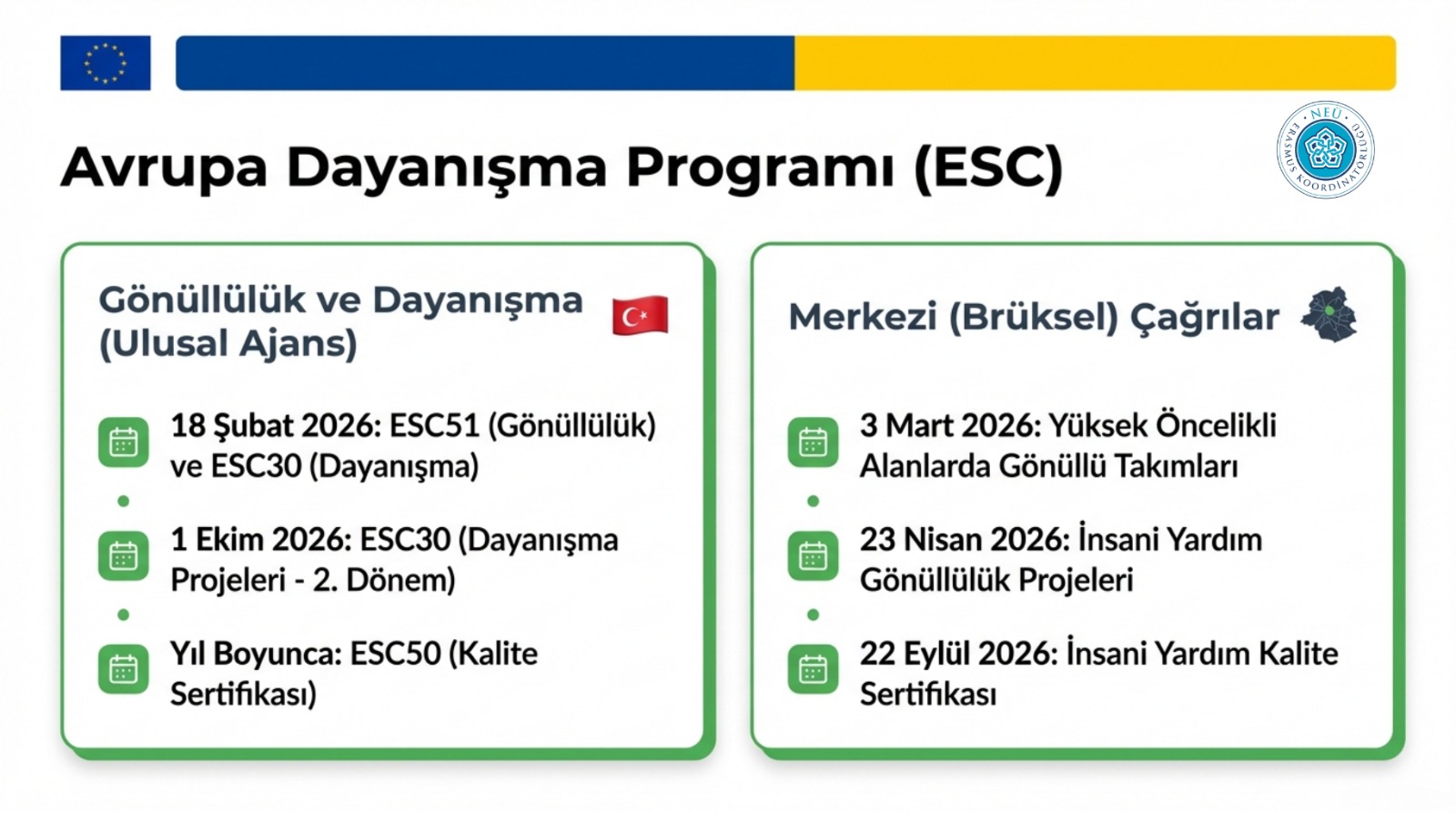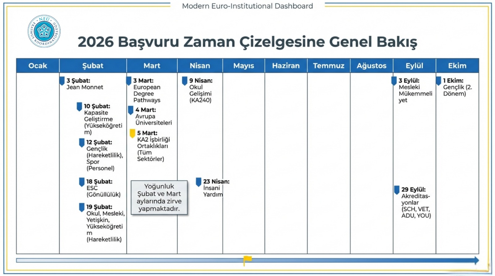 2026 yılı Erasmus+ ve Avrupa Dayanışma Programı (ESC) kapsamında proje başvurusu yapacak personelimiz için Şubat ve Mart ayları başvuru takvimi özetlenmiştir.