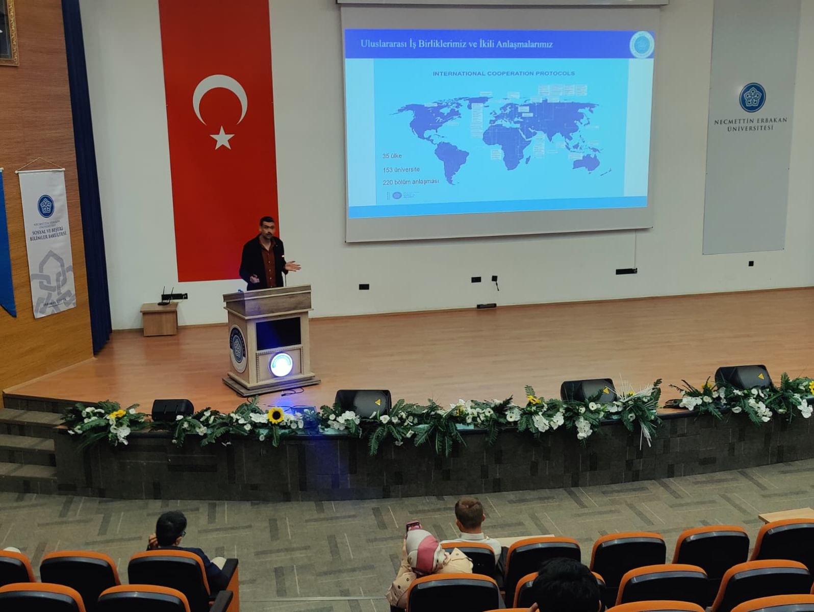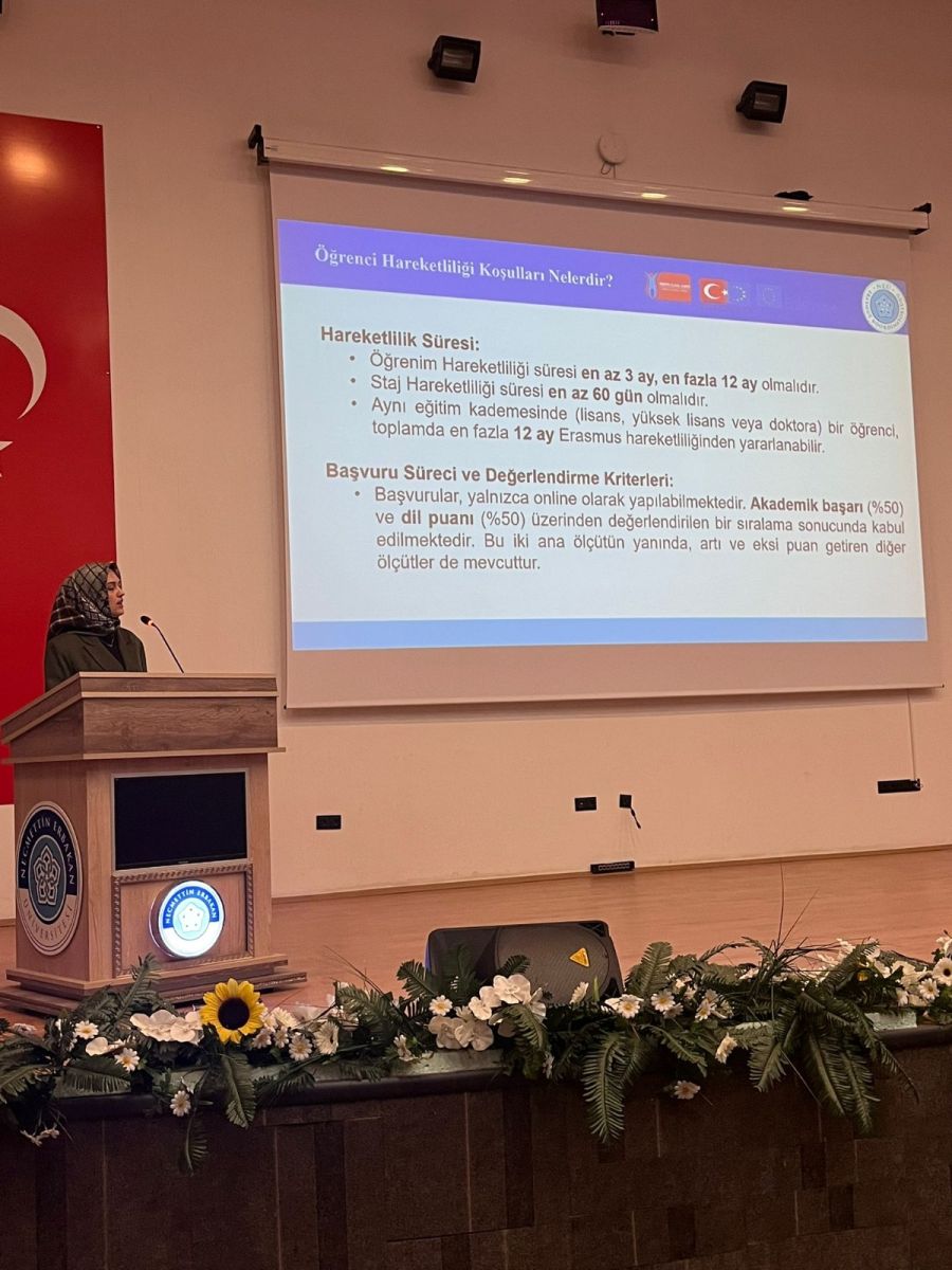 Öğrencilere, öğrenim ve staj hareketliliklerinde izlenecek adımlar, gerekli belgeler ve başvuru takvimi aktarılırken; personel hareketliliği kapsamında ders verme ve eğitim alma faaliyetlerine ilişkin güncel uygulamalara da değinildi. Etkinlik sonunda katılımcıların soruları yanıtlanarak Erasmus+ programı hakkında merak edilen konulara açıklık getirildi.