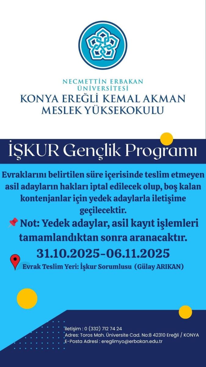 Necmettin Erbakan Üniversitesi Rektörlüğü Yaka Mah. Yeni Meram Cad. Kasım Halife Sok. No: 11/1 (A Blok) No: 11 (B Blok) Posta Kodu: 42090 Meram / KONYA