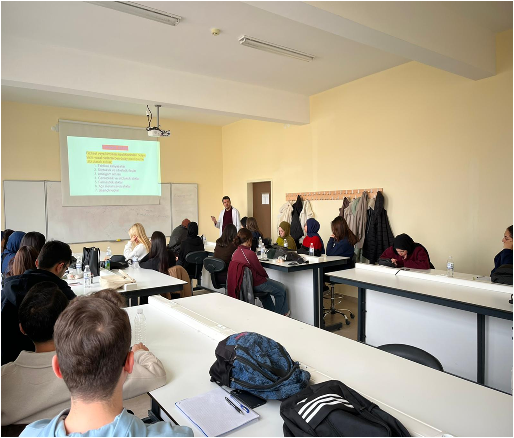 Öğrencilerimizin ileride görev alacakları hastane, klinik ve laboratuvar gibi sağlık kuruluşlarında sağlık atıklarının doğru ve güvenli şekilde yönetilmesi konusunda bilinç kazanmalarını sağlamak amacıyla Sağlıkta Atık Yönetimi Eğitimi düzenlenmiştir. Eğitimde; sağlık atıklarının türleri, atıkların kaynağında ayrıştırılması, uygun renk ve özellikteki atık kutularına atılması, geçici depolama, bertaraf ve yetkili birimlere teslim süreçleri ayrıntılı olarak ele alınmıştır.