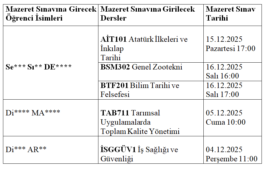 2025-2026 Eğitim-Öğretim Yılı Güz Dönemi ara sınavlarına mazeretleri sebebiyle katılamayan ve aşağıda isimleri belirtilen öğrencilerin, tarihi ve saati belirtilen mazeret sınavlarına katılmalarının uygun olduğu görülmüştür. Sınav yeri için ortak derslerin sorumlu öğretim üyesi ile iletişime geçilmesi gerekmektedir.
