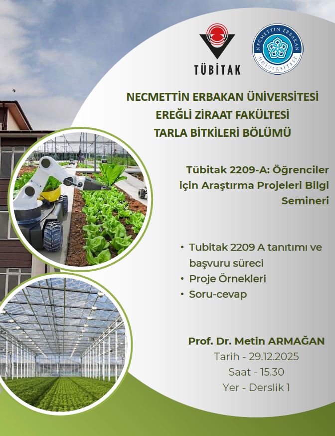 TÜBİTAK 2209-A Üniversite Öğrencileri Araştırma Projeleri Destekleme Programı kapsamında, Necmettin Erbakan Üniversitesi Ereğli Ziraat Fakültesi Tarla Bitkileri Bölümü öğrencilerine yönelik proje hazırlama sürecine ilişkin bir eğitim düzenlendi. Eğitim, Tarla Bitkileri Bölümü öğretim üyemiz Prof. Dr. Metin ARMAĞAN tarafından verildi.