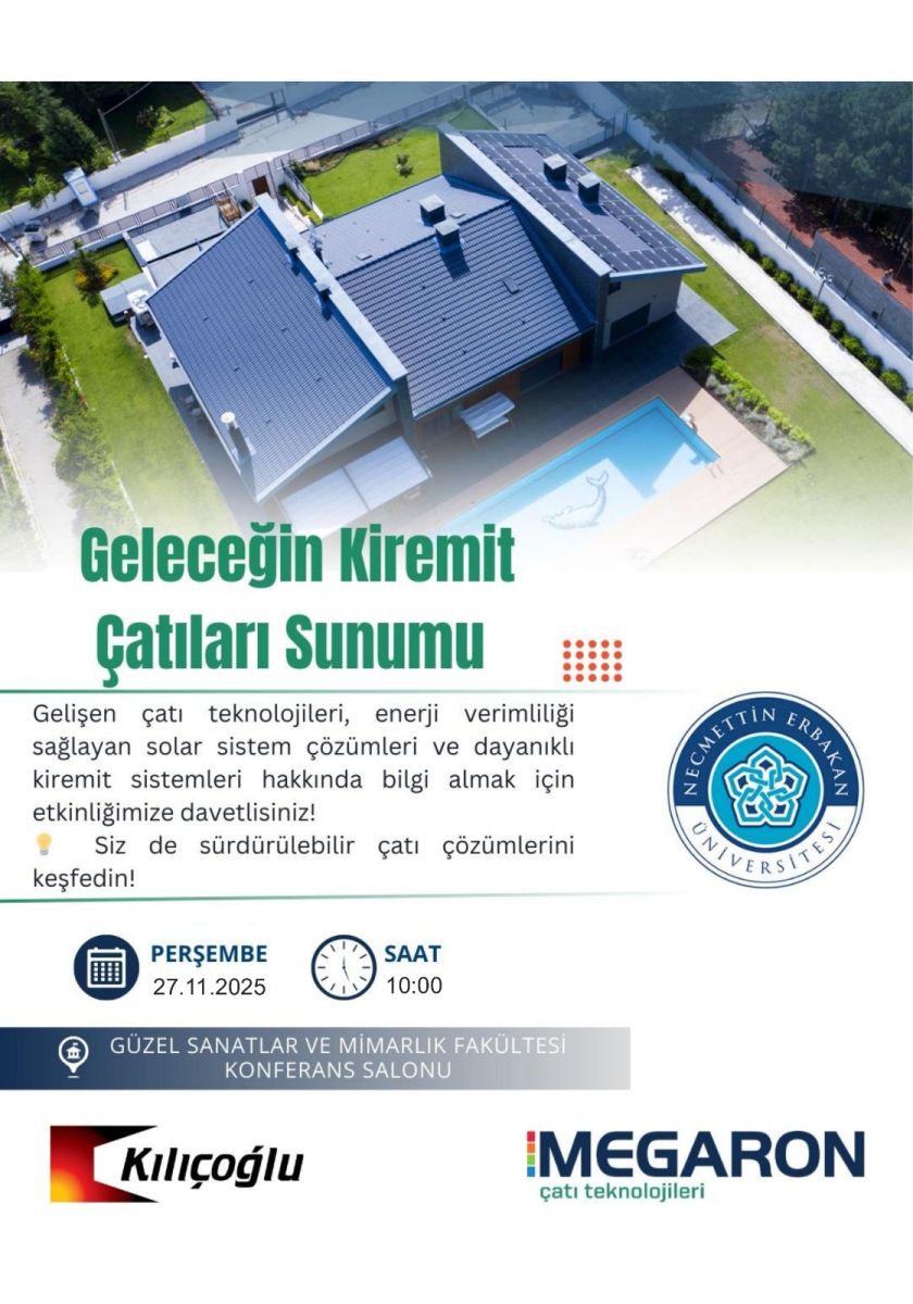 "Geleceğin Kiremit Çatıları" başlıklı sunum 27.11.2025 perşembe saat: 10.00'da Güzel Sanatlar ve Mimarlık Fakültesi konferans salonunda gerçekleşecektir.