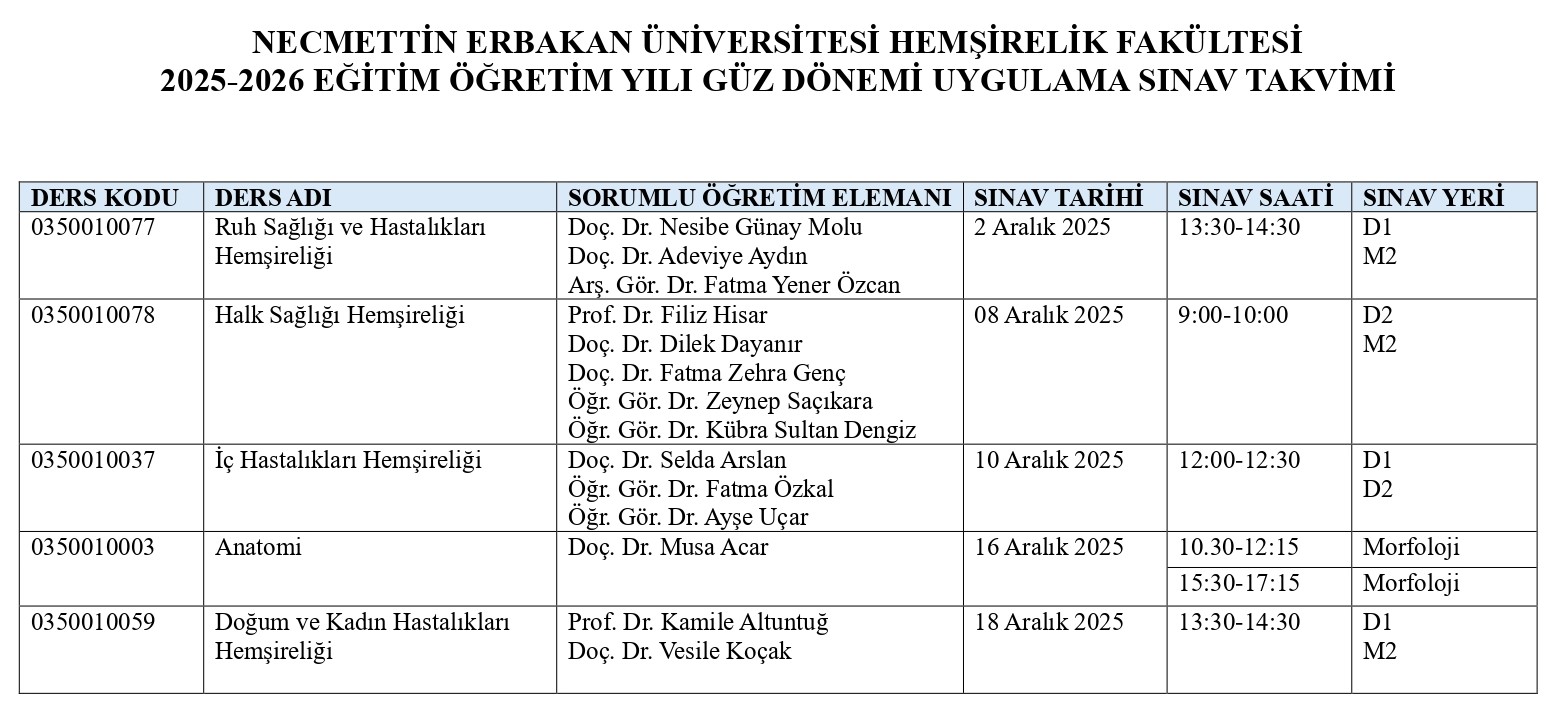 2025-2026 EĞİTİM ÖĞRETİM YILI GÜZ DÖNEMİ UYGULAMA SINAV TAKVİMİ