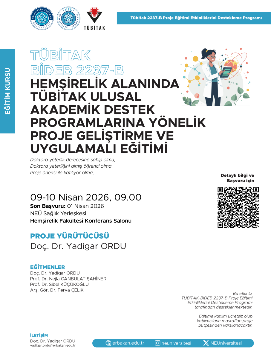 Etkinliğin Amaç ve Kapsamı: Bu etkinliğin amacı, hemşirelik alanında doktora yeterlik derecesine sahip bilim insanlarının ve yeterliğini almış doktora öğrencilerinin TÜBİTAK projesi geliştirme ve ulusal akademik destek programlarına yönelik bilgi ve beceriye sahip olmasıdır.