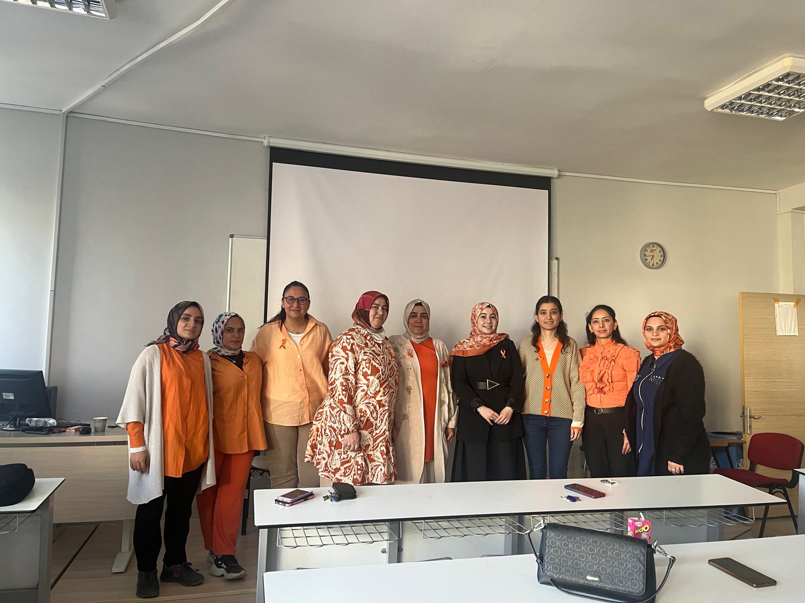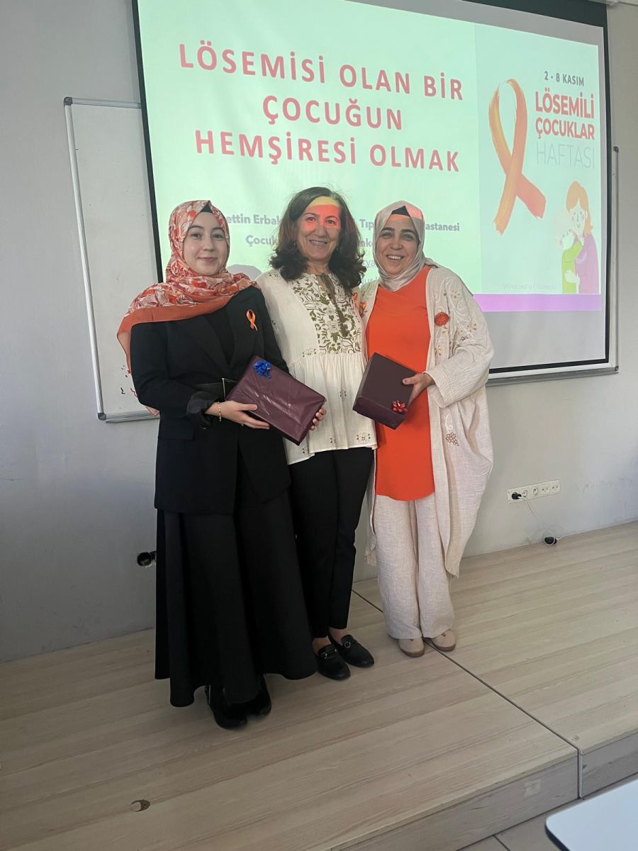 Necmettin Erbakan Üniversitesi Hemşirelik Fakültesi Çocuk Sağlığı ve Hastalıkları Hemşireliği Anabilim Dalı ve Sağlık İçin El Ele Öğrenci Topluluğu iş bilirliği ile 27.10.2025 tarihinde Hemşirelik Fakültesinde “Lösemisi Olan Bir Çocuğun Hemşiresi Olmak” konulu etkinlik düzenlendi. Etkinlikte NEÜ Tıp Fakültesi Hastanesi Çocuk Hematoloji-Onkoloji Servis Sorumlusu Derya ÜNLÜ ve Uzman Hemşire Kübra Nur KÖROĞLU konuşmacı olarak yer aldı. Yapılan etkinliğe fakülte akademisyenleri ve 102 öğrenci katılım sağladı. Etkinlik kapsamında lösemiye yönelik farkındalık oluşturmak amacıyla lösemi ve lösemisi olan çocukların hemşiresi olmaya yönelik konu başlıkları ile deneyimlerden bahsedildi. Konuşmacıların sunumlarının ardından katılımcıların soruları yanıtlanarak etkinlik sonlandırıldı. Konuşmacılara Çocuk Sağlığı ve Hastalıkları Hemşireliği Anabilim Dalı Başkanı Prof. Dr. Emine GEÇKİL tarafından teşekkür belgesi takdim edildi. Çocuk Sağlığı ve Hastalıkları Hemşireliği Anabilim Dalı ve Sağlık İçin El Ele Öğrenci Topluluğu
