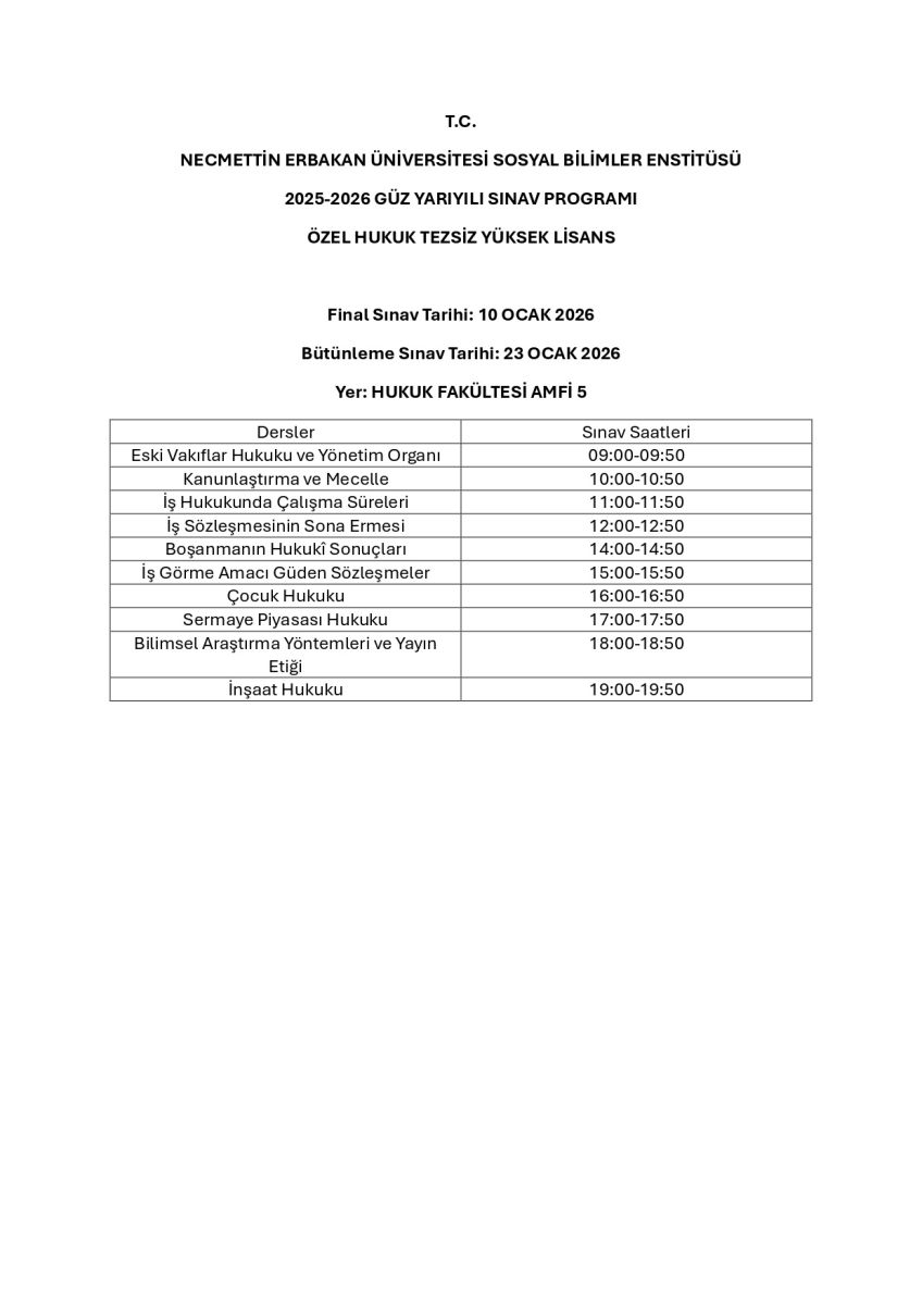 2025-2026 GÜZ YARIYILI ÖZEL HUKUK TEZSİZ YÜKSEK LİSANS SINAV PROGRAMI