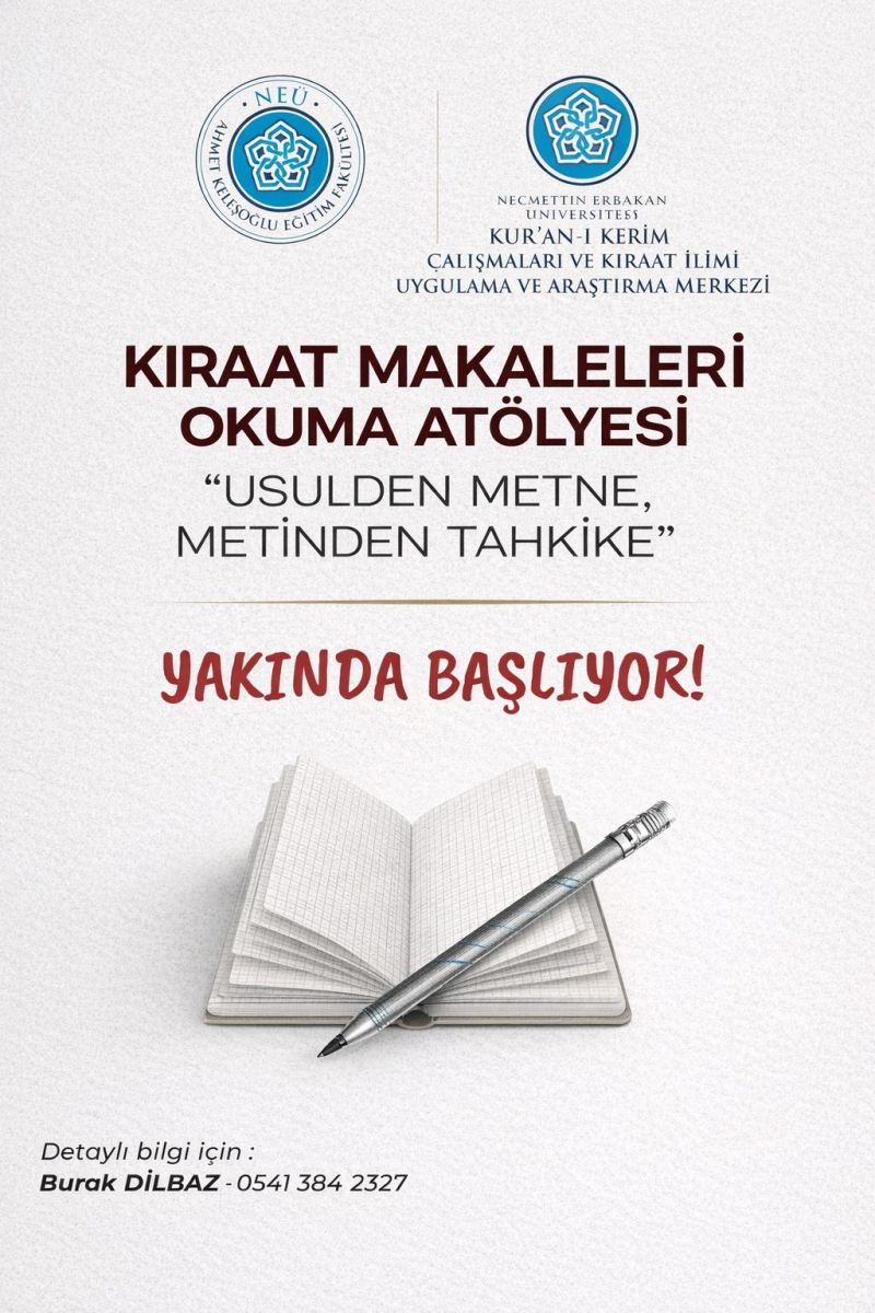Necmettin Erbakan Üniversitesi Kur'an-ı Kerim Çalışmaları ve Kıraat İlmi Uygulama ve Araştırma Merkezi'nin koordinesinde Kıraat Makaleleri Okuma Atölyesi yakında başlıyor.