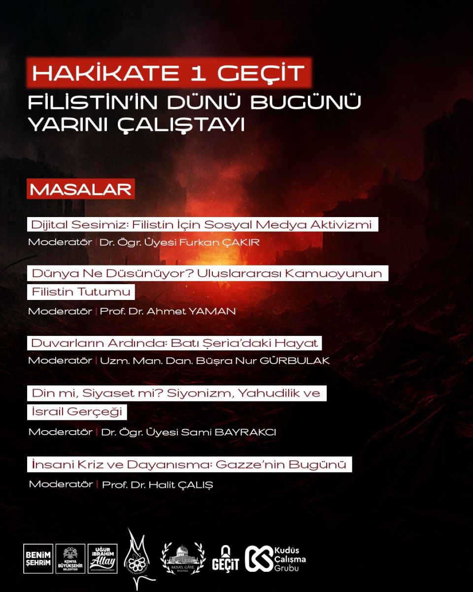 Filistin'in Dünü Bugünü Yarını Çalıştayı Fakültemiz öğretim üyelerinin Prof. Dr.Ahmet Yaman, Prof.Dr. Halit Çalış ve Doç.Dr. Ali Dadan'ın katılımlarıyla gerçekleşti.