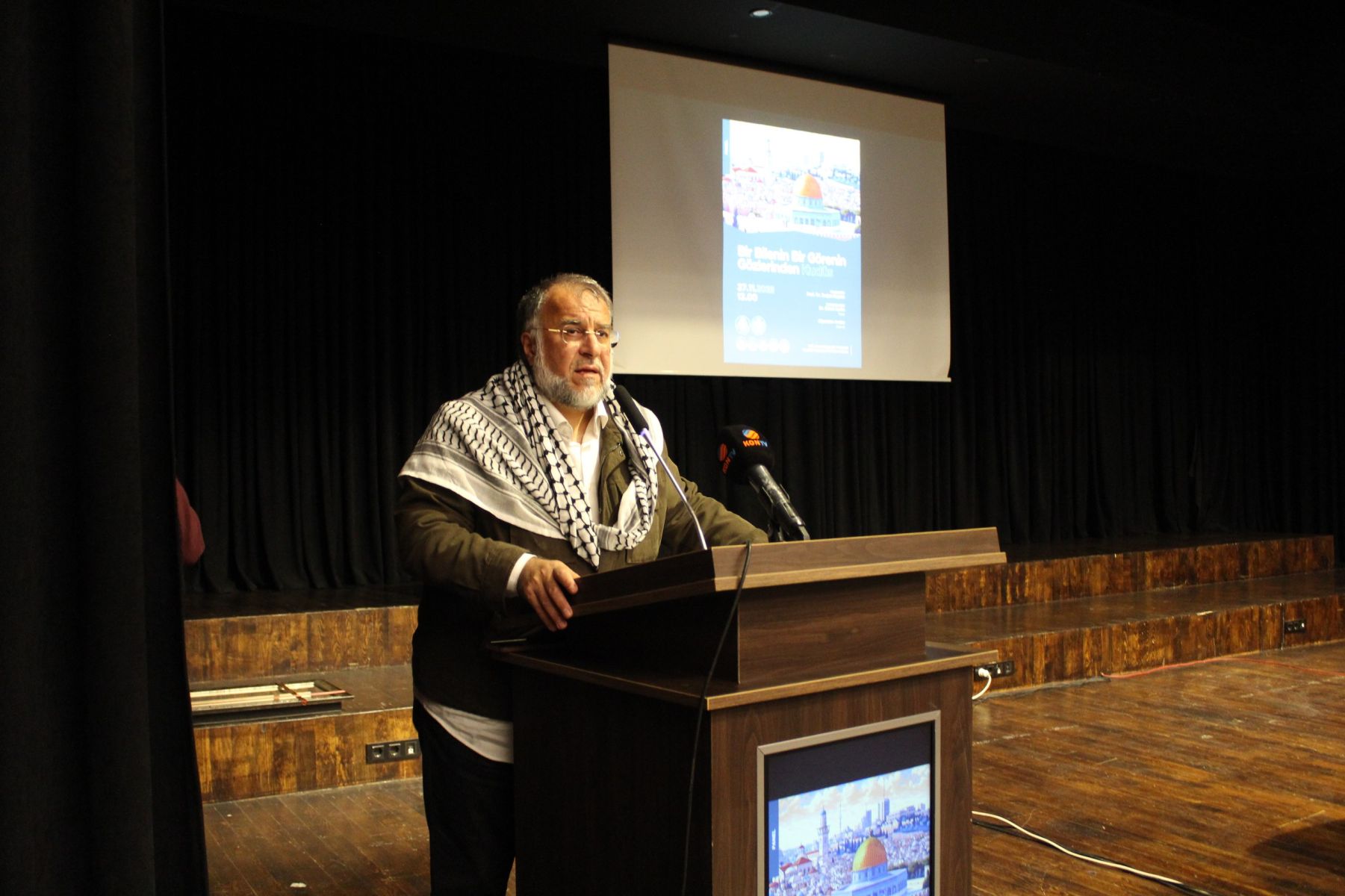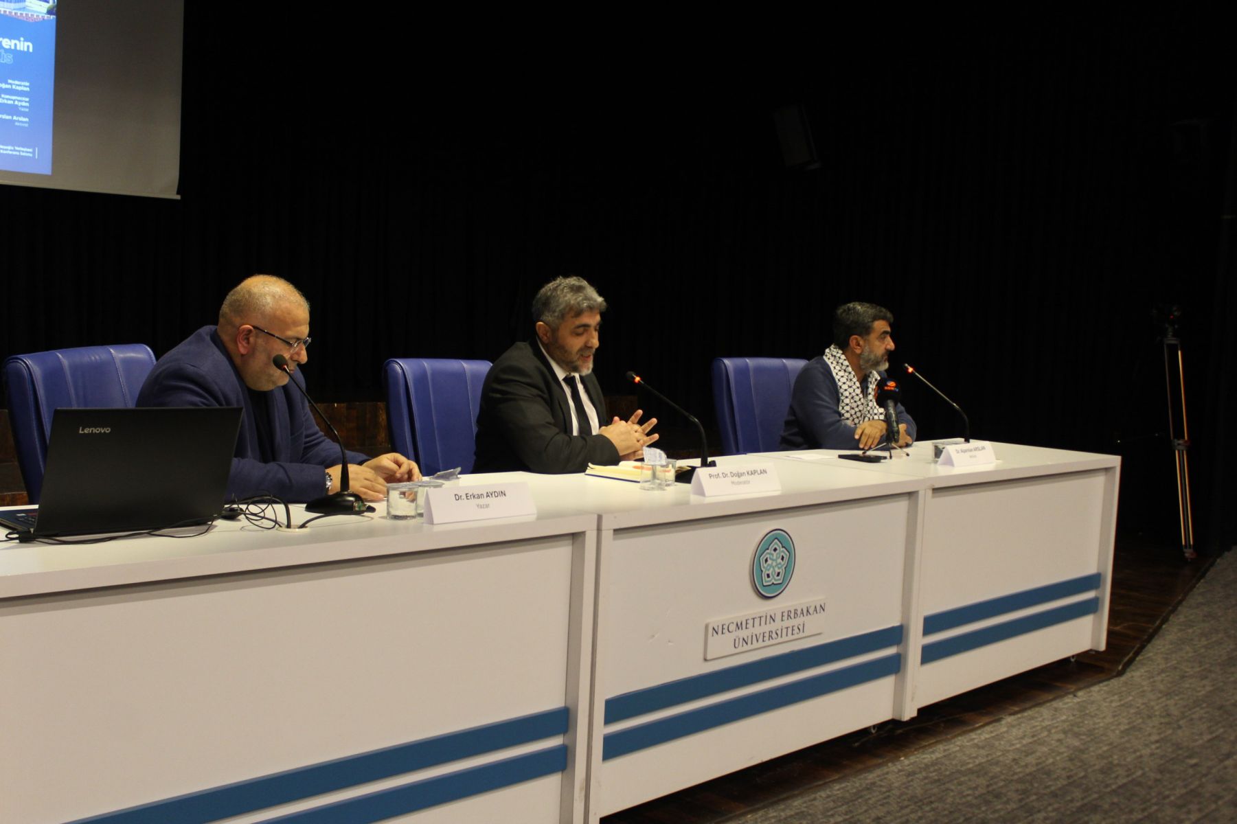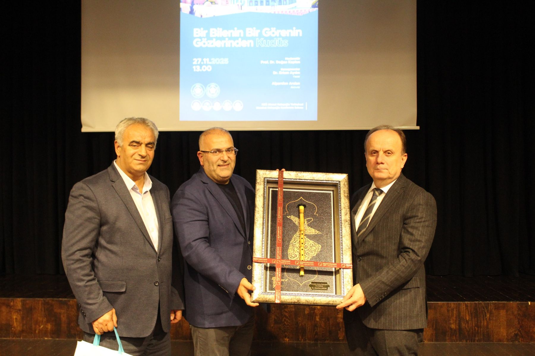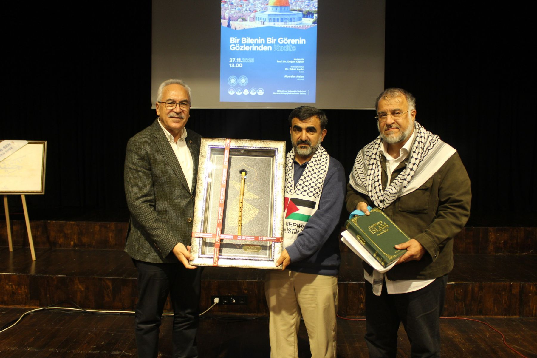 Fakültemiz öğretim üyesi Prof. Dr. Doğan Kaplan'ın moderatörlüğünü üstlendiği panelde yazar Dr. Erkan Aydın, Kudüs'ün tarihi, dini ve kültürel arka planının yanı sıra yirmi yılı aşkın gerçekleştirdiği Kudüs ziyaretlerine dair gözlemlerini aktardı. Aktivist Alparslan Arslan ise Gazze için yola çıkan Küresel Sumud Filosu ile birlikte yaşadığı deneyimleri ve duygu yüklü anekdotları dinleyicilere aktardı. Ardından konuşmacılara hediyeleri milletvekilleri ve fakülte dekanları tarafından takdim edildi.