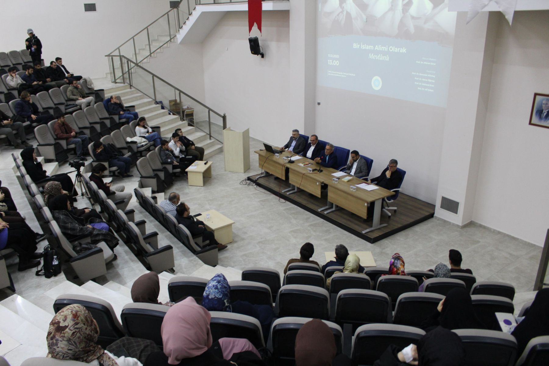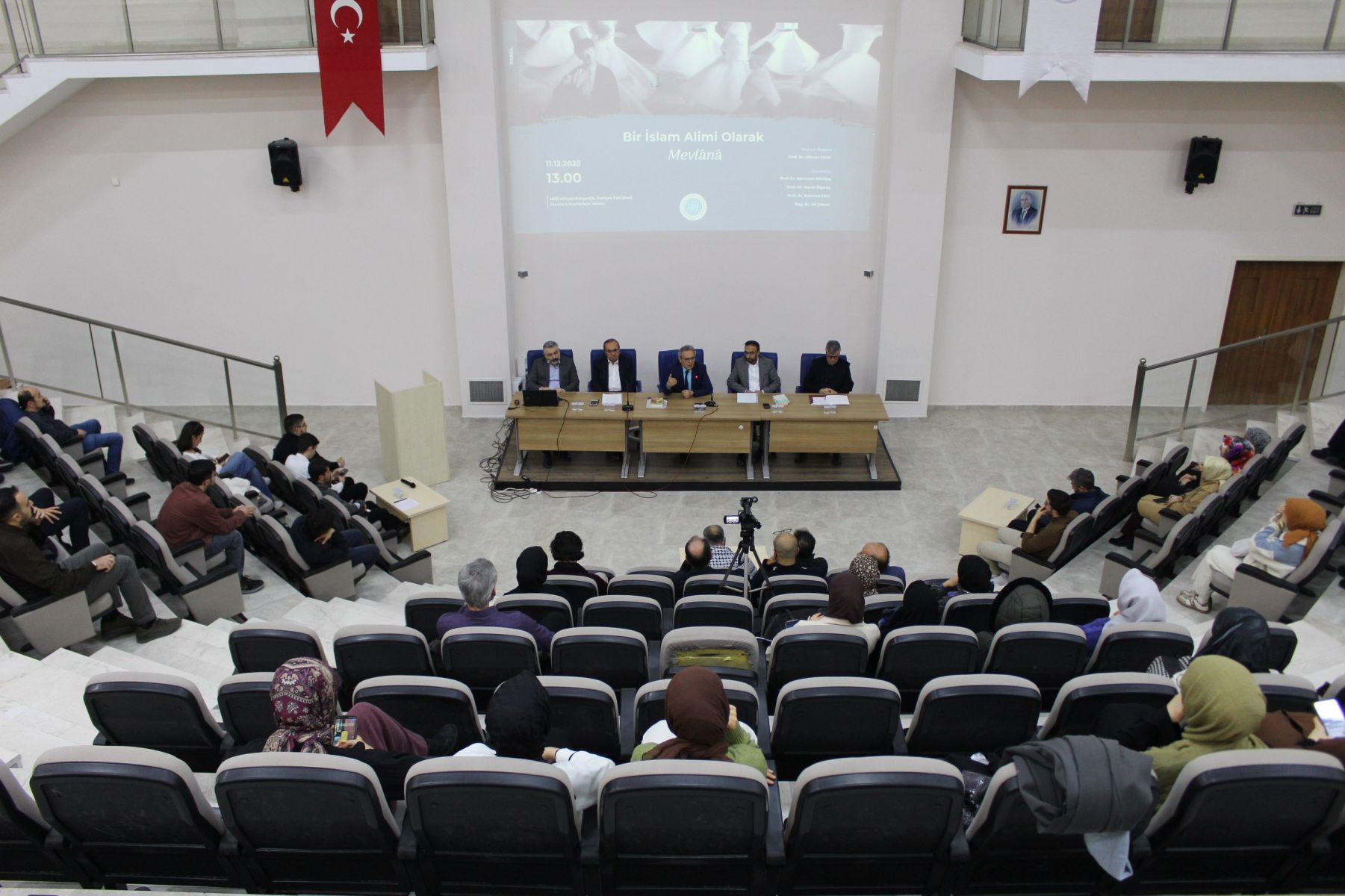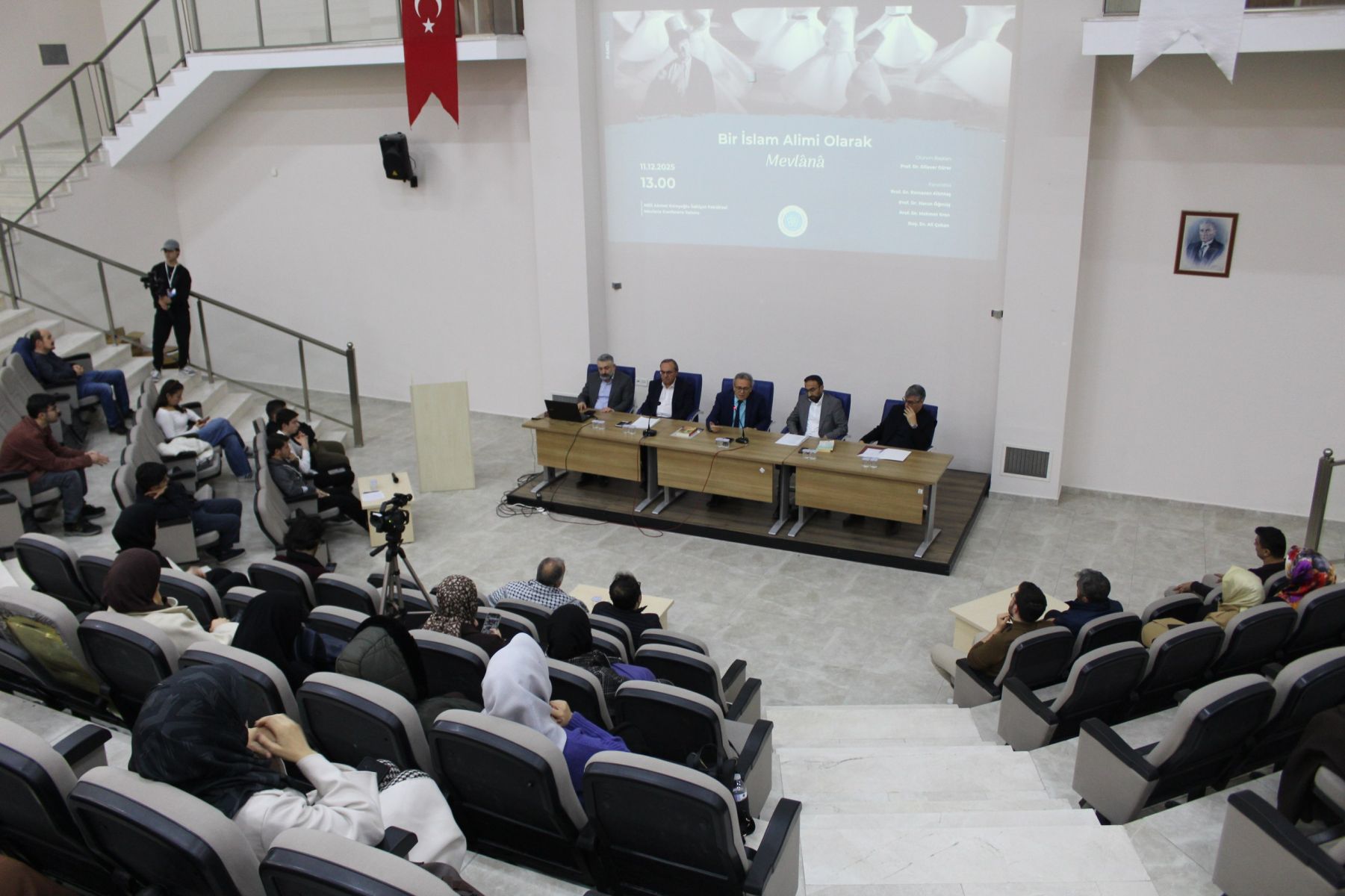 Fakültemiz öğretim üyesi Prof. Dr. Dilaver Gürer’in oturum başkanlığını yürüttüğü panelde fakültemiz öğretim üyeleri Prof. Dr. Ramazan Altıntaş, Prof. Dr. Mehmet Eren, Prof. Dr. Harun Öğmüş ve Doç. Dr. Ali Çoban, Mevlana’nın âlim portresine dair farklı disiplinler çerçevesinde sunum yaptılar.