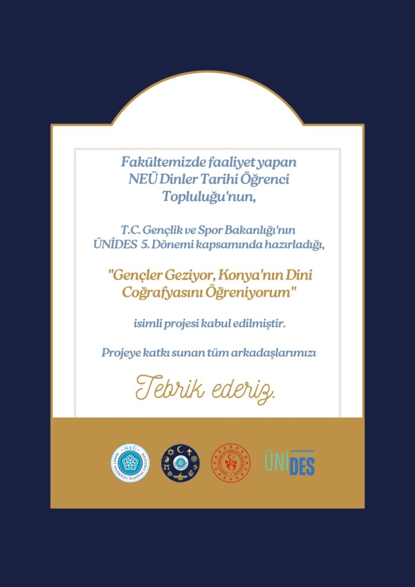 Fakültemizde faaliyet gösteren Dinler Tarihi Öğrenci Topluluğu’nun projesi Gençlik ve Spor Bakanlığı’nın 5. Dönem ÜNİDES Projeleri kapsamında kabul edilmiştir. Öğrencilerimizi tebrik ederiz.