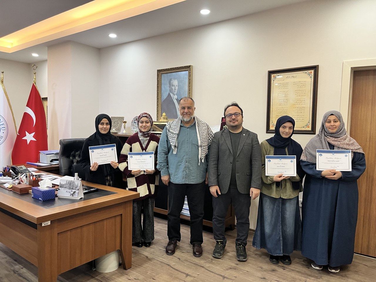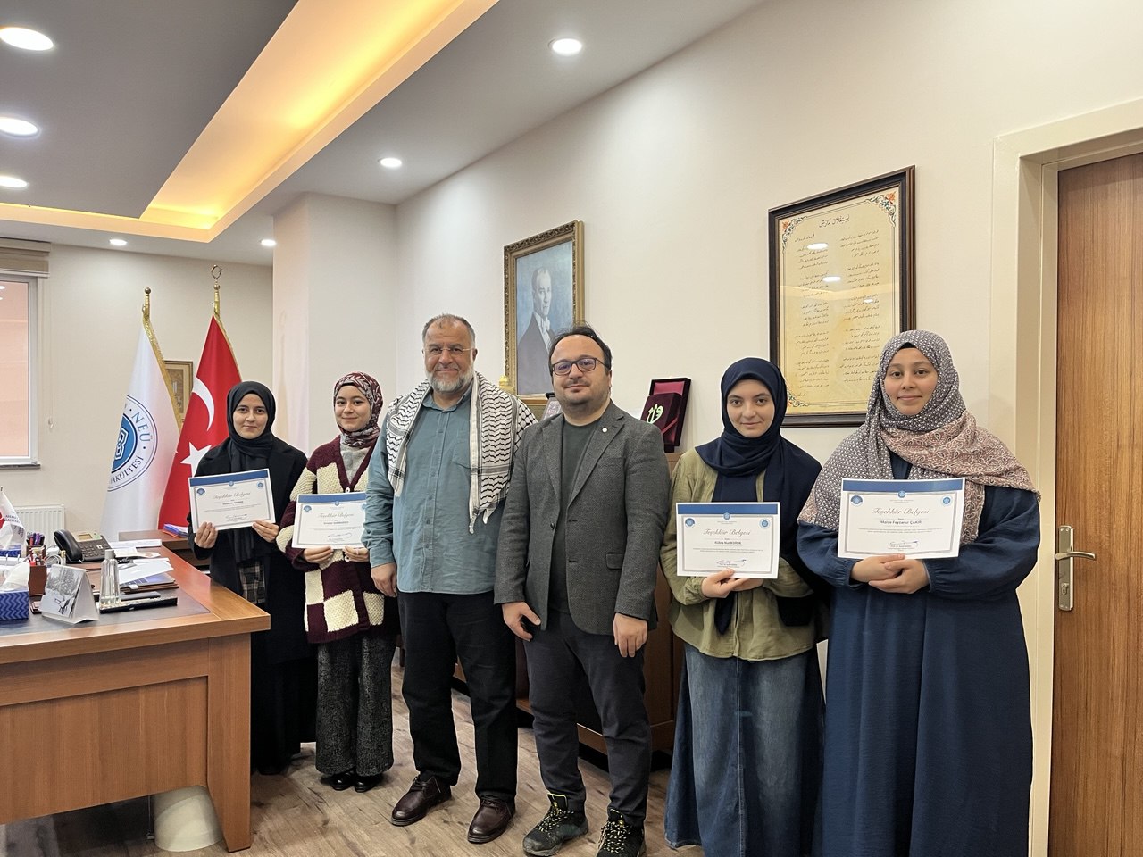 Fakültemiz programlarına gelen misafir konuşmacılara hediye olarak verilmek üzere hat ve tezhip içerikli sanat tabloları hazırlayan öğrencilerimiz Kübra Nur Koruk, Maide Feyzanur Çakır, Gülseren Yaman, Kezban Rana Yaşın ve Erva Sarıbabıçcı’ya Dekanımız Prof. Dr. Kamil Güneş teşekkür belgesi takdim etti.