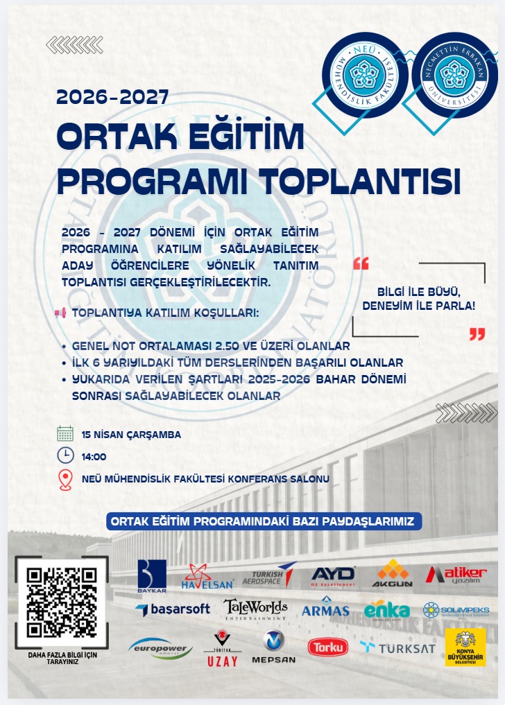 2026-2027 Ortak Eğitim Programı Toplantısı 15 Nisan Çarşamba saat 14:00'da Mühendislik Fakültesi konferans salonunda gerçekleştirilecektir. İlgili detaylara paylaşılan afiş üzerinden erişebilirsiniz.