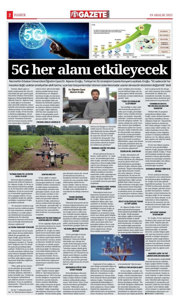 Bilgisayar Mühendisliği Bölümü Hocamız Dr. Öğr. Üyesi Alperen Eroğlu, Türkiye'nin 5G Stratejisini Gazete Konyam'a açıklamıştır.