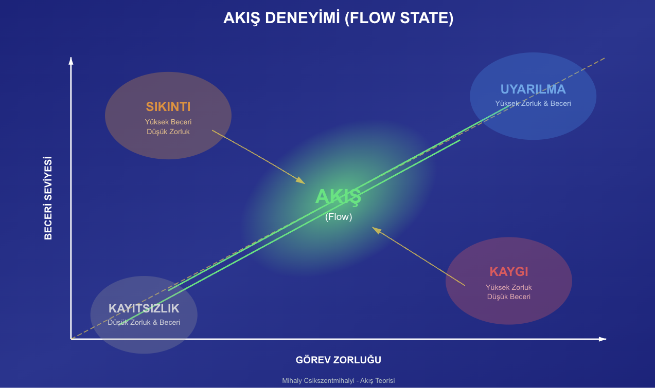 Csikszentmihalyi’ye (2014)’e göre çoğu birey, hayatlarındaki en olumsuz yaşantıları, odaklarının tümünü kendilerine verdiği anlarda yaşamaktadır. Bu yaşantılar bireyin savunmaya geçmesi ve yetersizlik hissinin tetiklenmesine yol açabilmektedir. Odağın farklı yerlere çevrilmesi, endişe hissinin ortaya çıkışını engellemektedir (Dede, 2023). Tam aksine bireyin kendini iyi hissettiği anlar ise bireyi bütüncül olarak zorlayan görevleri tamamlamak için gösterdiği bilinçli çabayla ortaya çıkmaktadır (Dede, 2023). Bu bağlamda akış deneyiminin bireylerin psikolojik iyi oluşuna katkı sağladığı tahmin edilmektedir (Dede, 2023).