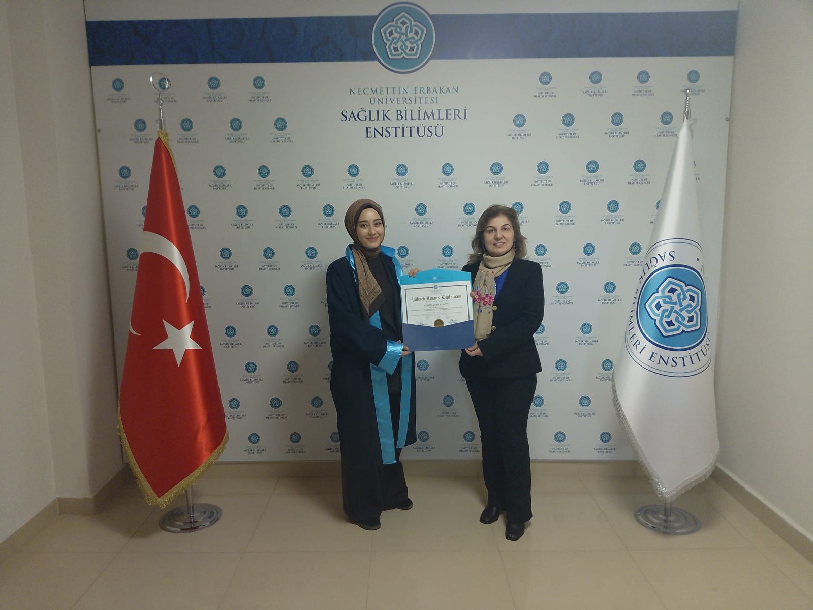 Enstitümüz Hemşirelik Anabilim Dalı Yüksek Lisans programından mezun olan öğrencimiz Müberra Ahsen KALBURCU'ya diplomasını Enstitü Müdürümüz Prof. Dr. Hasibe VURAL takdim etmiştir.