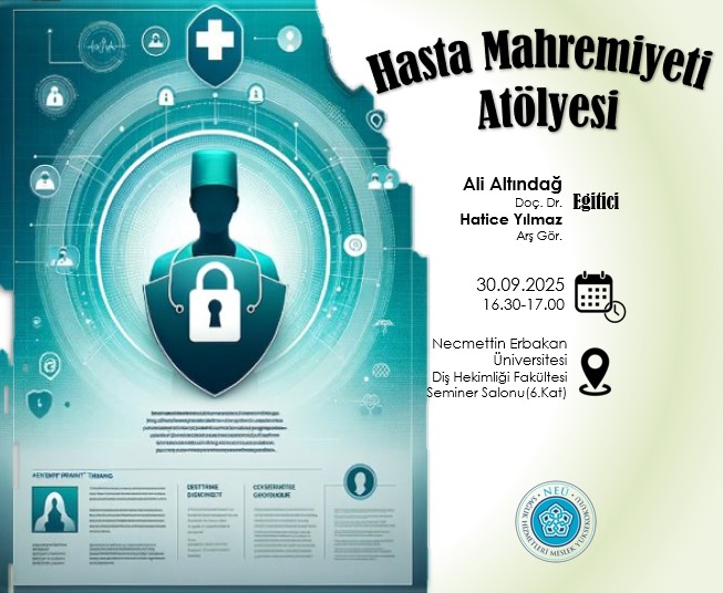 Hastaların mahremiyetine özen göstermek, sağlık hizmetlerinin temel ilkelerinden ve etik yükümlülüklerinden biridir. Bu anlayışla düzenlediğimiz “Hasta Mahremiyeti Atölyesi” etkinliğine sizleri davet ediyoruz. Bu eğitim programı, sağlık çalışanlarının hasta mahremiyeti konusundaki bilgi ve uygulama becerilerini geliştirmeyi hedeflemektedir. Atölye kapsamında; mahremiyetin önemi, ilgili yasal düzenlemeler, ihlallerin yol açabileceği sonuçlar ve bu ihlallerin önlenmesine yönelik alınabilecek önlemler ayrıntılı biçimde ele alınacaktır. Etkinliğimiz, sağlık profesyonellerinin yanı sıra sağlık yönetimi alanında görev yapan tüm katılımcılara açıktır. Sizleri bu değerli eğitime katılmaya davet eder, mesleki gelişiminize katkı sağlamanın ve hasta bakımında daha güvenli, etik uygulamaları desteklemenin mutluluğunu paylaşmak isteriz. Eğitici Doç. Dr. Ali Altındağ Arş. Gör. Hatice Yılmaz 30.09.2025 16.30-17.00 Necmettin Erbakan Üniversitesi Diş Hekimliği Fakültesi 6. Kat Seminer Salonu