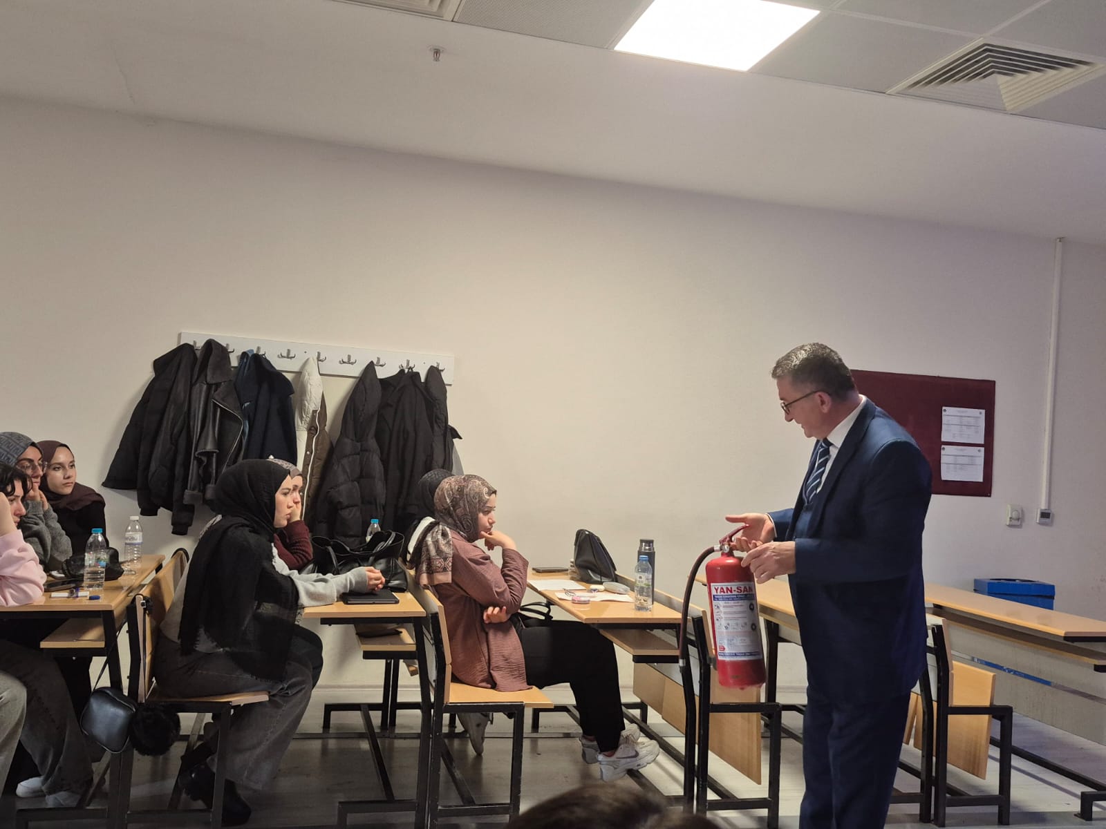6 Şubat 2023 tarihinde yaşanılan Kahramanmaraş depremlerinin yıl dönümünde meslek yüksekokulumuz öğretim elemanlarından Öğr. Gör. Dr. Yasemin Öztürk öncülüğünde İlk ve Acil Yardım Programı 1. sınıf öğrencilerimize Necmettin Erbakan Üniversitesi Tıp Fakültesi Hastanesi Sivil Savunma Amiri Musa Kazım Aksel tarafından temel afet bilinci eğitimi verildi. Öğrencilerimizin afetler konusunda farkındalık kazanmaları ve depreme karşı hazırlıklı olmaları amacıyla düzenlenen eğitimin sonunda öğrencilerimizin bir yangın anında neler yapması gerektiği ve yangın tüpünün kullanımına yönelik bilgilerde verildi. Değerli katkılarından dolayı Sayın Musa Kazım Aksel’e teşekkürlerimizi sunarız.