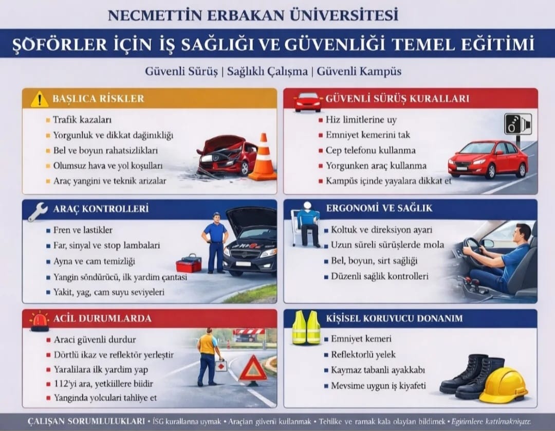Programa, Üniversitemiz İş Sağlığı ve Güvenliği Koordinatörlüğü Koordinatör Yardımcısı ve İş Güvenliği Uzmanı Şemsettin KUNT katılım sağladı. Eğitim kapsamında; iş sağlığı ve güvenliği kültürünün güçlendirilmesi, şoför personelin karşılaşabileceği iş ve trafik kazalarının önlenmesi, güvenli sürüş ve çalışma alışkanlıklarının geliştirilmesi ile acil durumlarda alınması gereken önlemler ele alındı. Ayrıca, 6331 sayılı İş Sağlığı ve Güvenliği Kanunu’nun temel hükümleri katılımcılara örnekler eşliğinde aktarılarak uygulamaya yönelik bilgilendirmelerde bulunuldu.