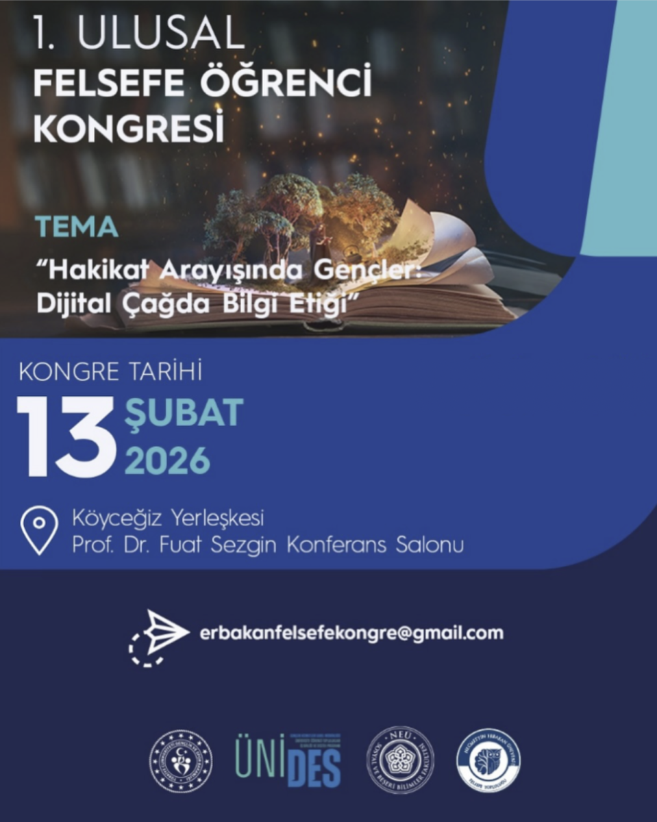 13 Şubat 2026 tarihinde gerçekleştirilecek olan “Hakikat Arayışında Gençler: Dijital Çağda Bilgi Etiği” temalı 1. Ulusal Felsefe Öğrenci Kongresi Programı'na buradan ulaşabilirsiniz.
