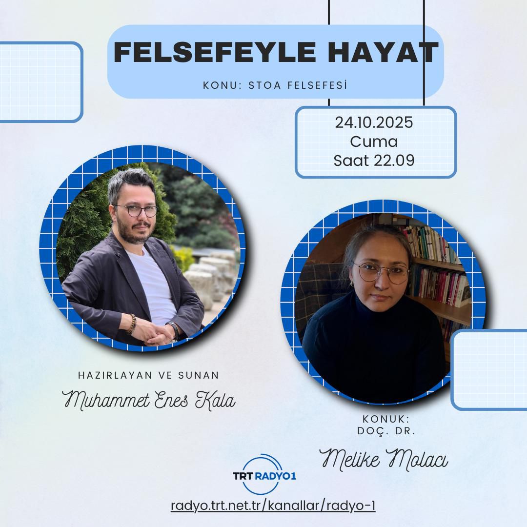 Bölümümüz öğretim üyelerinden Doç. Dr. Melike Molacı, TRT Radyo-1'de, Muhammet Enes Kala'nın sunduğu "Felsefeyle Hayat" isimli programda, programın bu haftaki konusu olan "Stoa Felsefesi" hakkında konuşmak üzere konuk olacaktır. Programda Doç. Dr. Molacı, Stoa felsefesinin önemine ve günümüzde Stoa felsefesine artan ilginin nedenlerine odaklanacaktır. Program Yayın Tarihi: 24.10.2025 Cuma --- Program Yayın Saati : 22.09