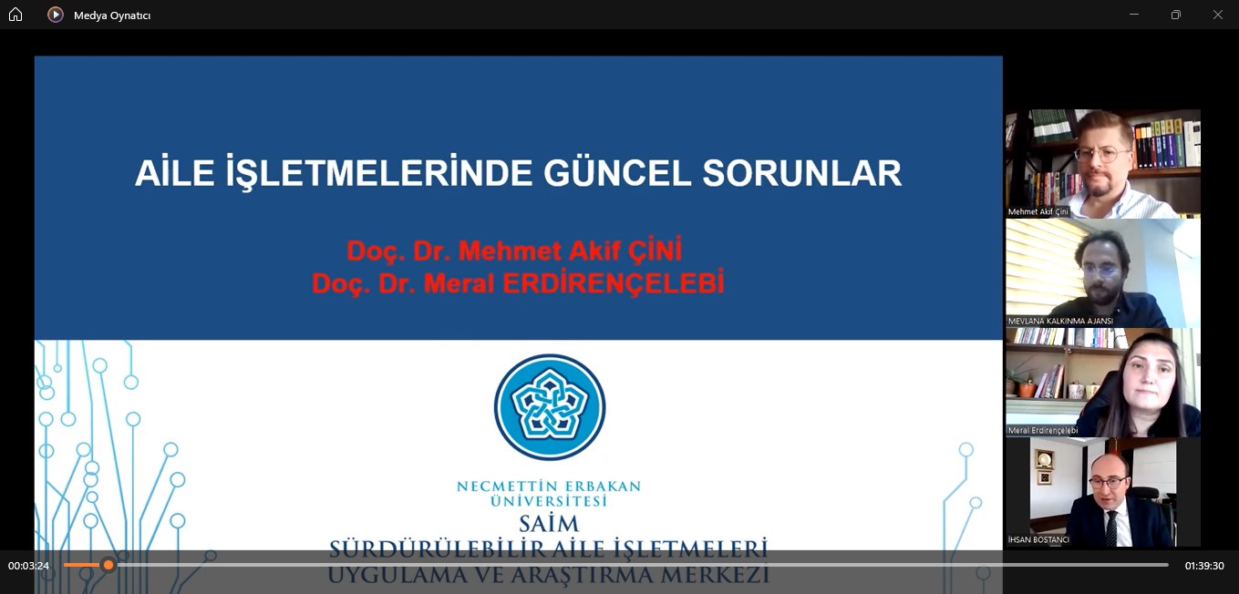Mevlana Kalkınma Ajansı tarafından düzenlenen webnara SAİM Müdür Yardımcıları Doç. Dr. Meral ERDİRENÇELEBİ ile Doç. Dr. Mehmet Akif Çini “Aile İşletmelerinde Güncel Sorunlar” başlığıyla konuşmacı olarak katıldılar. Açılış konuşmasını Mevlana Kalkınma Ajansı Genel Sekreteri İlhan Bostancı'nın yaptığı etkinlikte, SAİM Müdür Yardımcıları Doç. Dr. Meral ERDİRENÇELEBİ aile işletmelerinin üstün ve zayıf yönlerine değinerek son dönemde öneminin arttığı, işletmeler için sorun oluşturan dijital dönüşüm ve aile işletmelerinin bu sürece bakış açısını örnek raporla aktardı. Doç. Dr. Mehmet Akif Çini ise aile işletmeleri için önemi büyük olan aile anayasasının hukuki olarak nasıl hazırlanması gerektiği üzerine sunum yaptı.