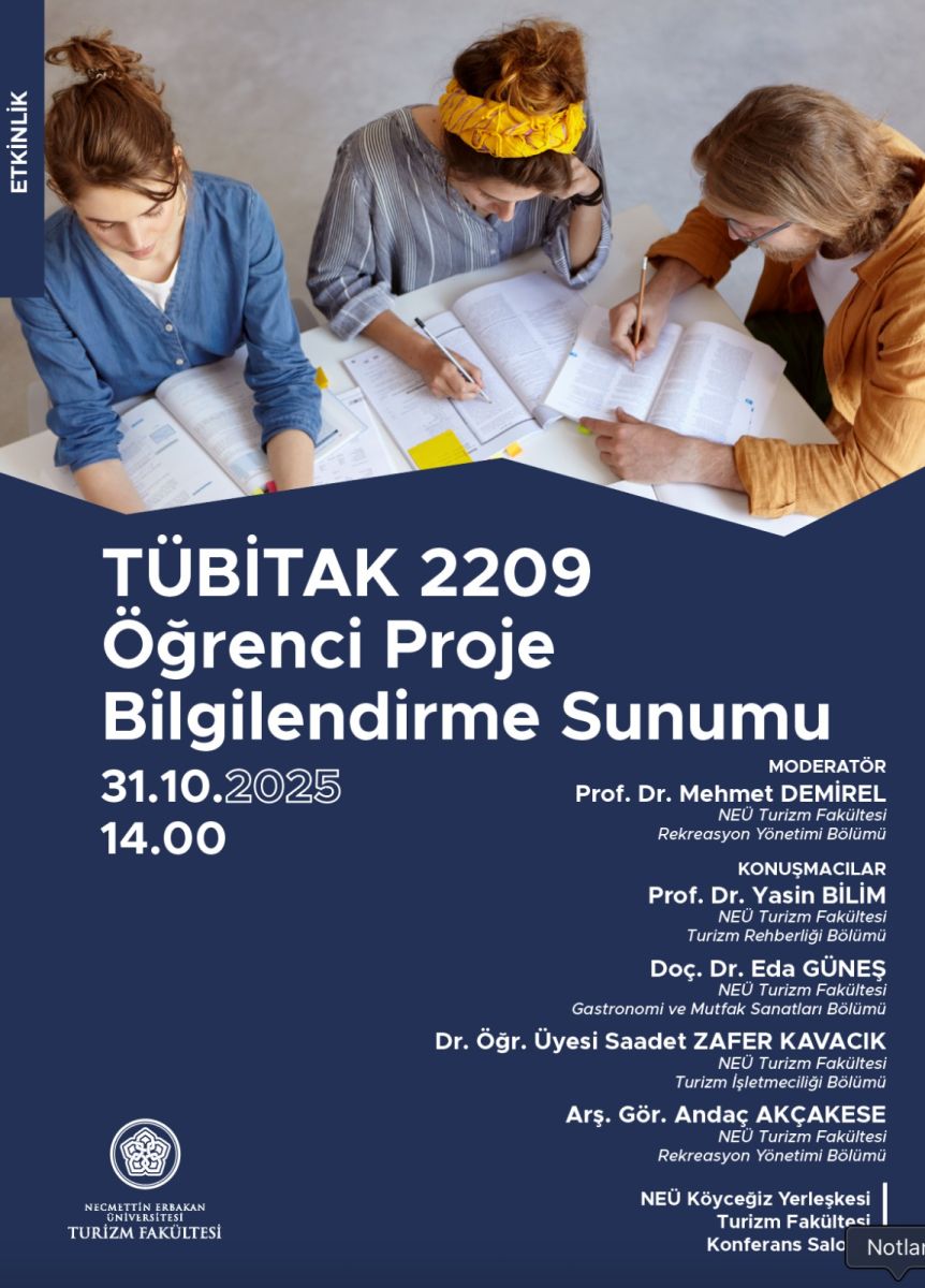 Necmettin Erbakan Üniversitesi Turizm Fakültesi tarafından, öğrencilerin bilimsel araştırma kültürünü geliştirmek ve TÜBİTAK 2209-A ile TÜBİTAK 2209-B öğrenci araştırma projeleri hakkında bilgi vermek amacıyla bir bilgilendirme sunumu düzenlenmektedir.