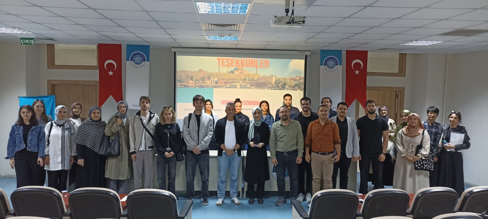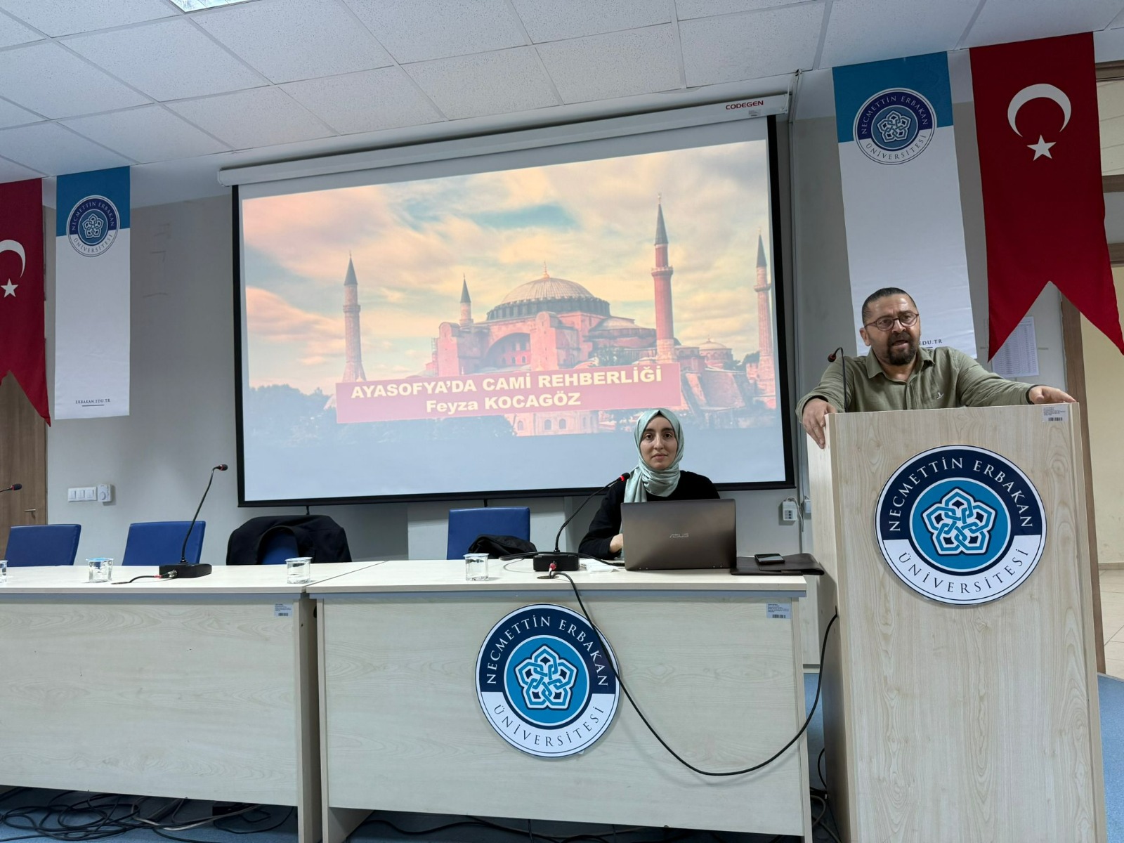 Fakültemiz konferans salonunda 07.10.2025 "Cami/Müze Rehberi Sunumuyla Ayasofya" söyleşi etkinliği düzenlenmiştir. Etkinliğin Moderatörlüğü Doç. Dr. Hasan Ali ERDOĞAN tarafından gerçekleştirilmiş olup konuşmacı Ayasofya Camii Rehberi Feyza KOCAGÖZ dür. Ayasofya rehberlik süreçlerinin, gelen misafir beklentilerinin konuşulduğu verimli söyleşi ardından, Sayın Feyza KOCAGÖZ e Dekanımız Prof. Dr. Mehmet DEMİREL tarafından plaket taktimi yapılarak söyleşi sonlandırılmıştır.