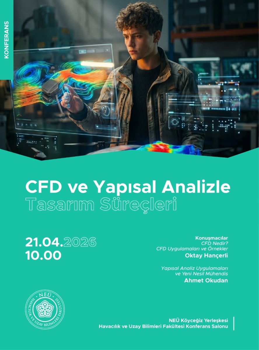 21.04.2026 (Salı), 10:00'da, Havacılık ve Uzay Bilimleri Fakültesi Konferans Salonunda, "CFD ve Yapısal Analizle Tasarım Süreçleri" hakkında seminer düzenlenecektir.