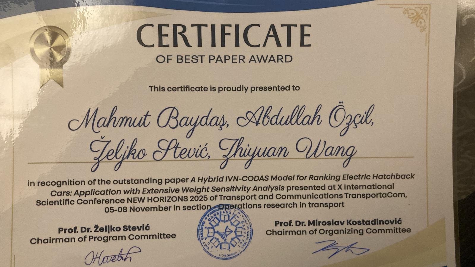 Doç. Dr. Mahmut Baydaş, Abdullah Özçil, Željko Stević ve Zhiyuan Wang ile birlikte hazırladıkları “A Hybrid IVN-CODAS Model for Ranking Electric Hatchback Cars: Application with Extensive Weight Sensitivity Analysis” başlıklı bildirileriyle konferansta “Best Paper Award” (En İyi Bildiri Ödülü) almaya hak kazandı.