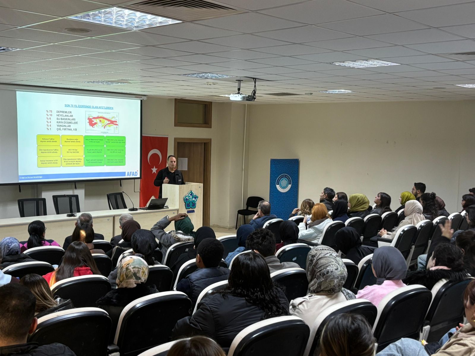 Necmettin Erbakan Üniversitesi Lojistik Yönetimi Bölümü öğretim üyelerinden Doç. Dr. Abdullah Oktay Dündar koordinatörlüğünde, “Afet ve İnsani Yardım Lojistiği” dersi müfredatı çerçevesinde 03.12.2025 tarihinde Fakültemiz Konferans Salonu’nda “Afet Farkındalık Eğitimi” konulu bilimsel bir etkinlik gerçekleştirilmiştir.