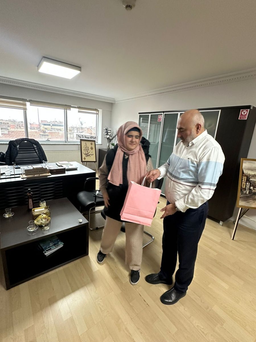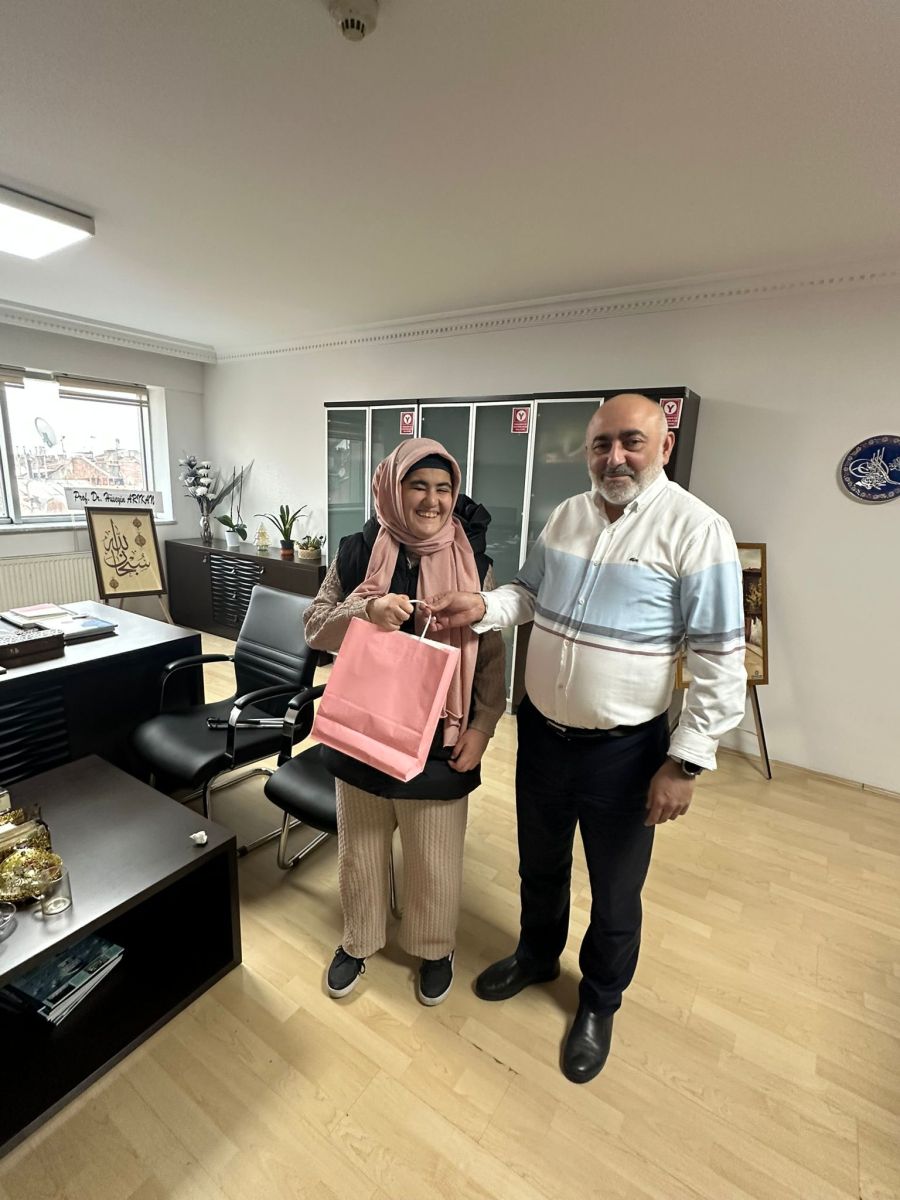 YADAM Müdürü Prof. Dr. Murat Çemrek, hazırlık sınıfı öğrencilerimizden görme engelli Elmas Gül Pınar’ı ve babasını makamında kabul etti. Prof. Dr. Çemrek, öğrencimiz için temin ettiği Braille alfabesiyle yazılmış kitabı kendisine hediye ederek başarılarının devamını diledi.