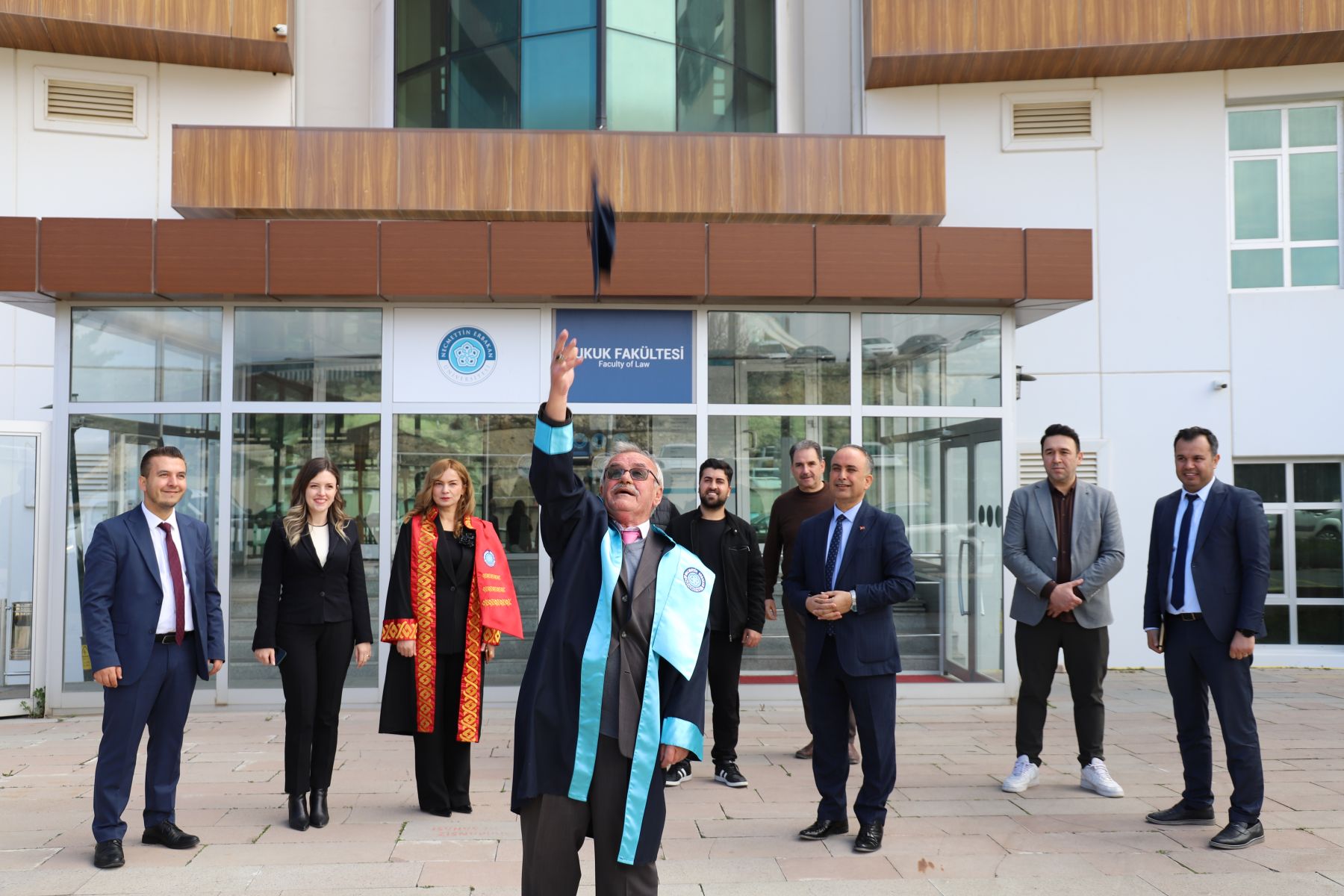 Düzenlenen törende konuşan Üniversitemiz Hukuk Fakültesi Dekanı Prof. Dr. Nuran Koyuncu, hukuk kavramının sadece kitaplardaki maddelerden ibaret olmadığını vurgulayarak, "Hukuk yalnızca kitaplarda yazan maddeler değildir; hukuk adalet ve doğrulukla yoğrulan bir yaşamdır. Siz de dürüstlük ve adaletle geçirdiğiniz ömrünüzü bu sembolik mezuniyet ile taçlandırdınız. En yeni, en kıdemli mezunumuza yolunuz açık olsun diliyoruz" şeklinde konuştu.