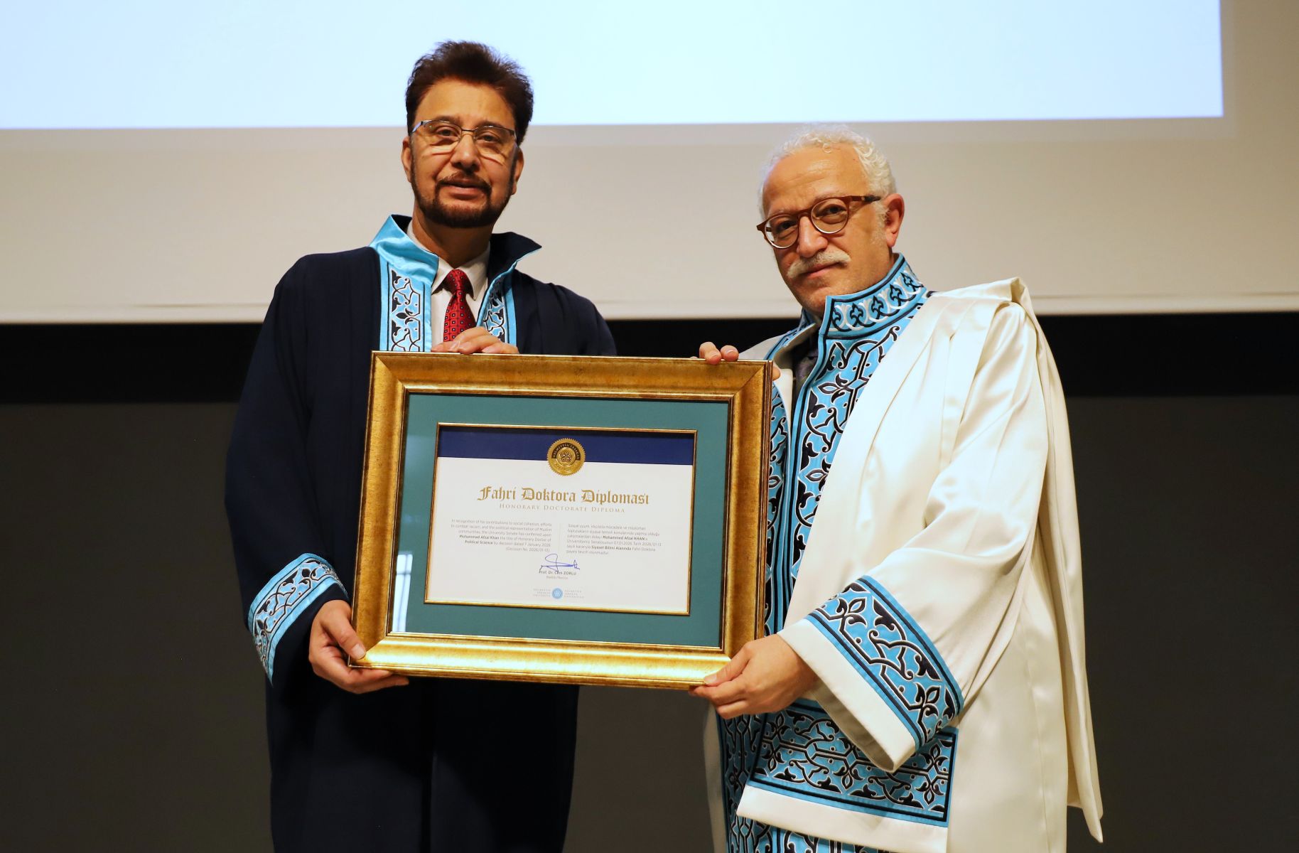 Konferansın ardından fahri doktora takdim törenine geçildi. Rektörümüz Prof. Dr. Cem Zorlu, Britanyalı siyasetçi Mohammed Afzal Khan’a doktora cübbesini giydirerek fahri doktora belgesini takdim etti. Tören, protokol üyelerinin sahneye davet edilmesi ve fotoğraf çekimiyle sona erdi.