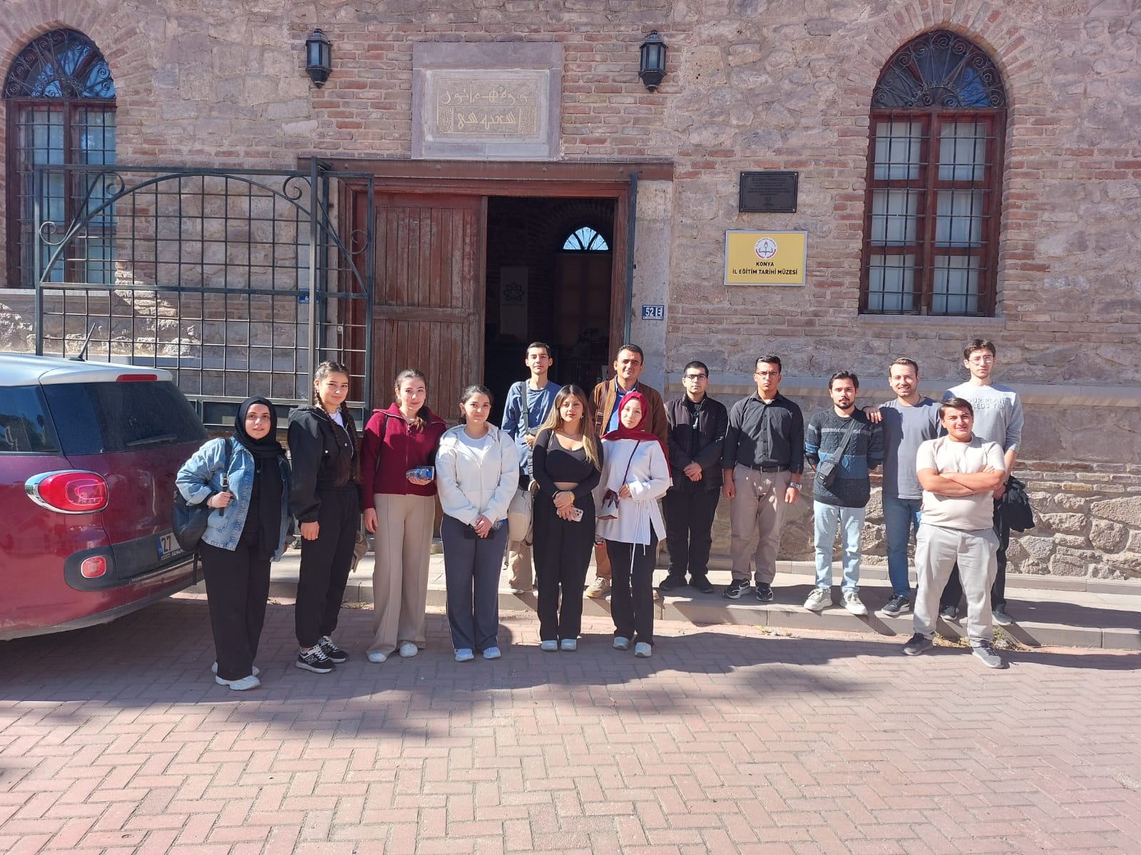 17 Ekim 2025 tarihinde Tarih Eğitimi Anabilim Dalı 1. Sınıf öğrencilerimiz Danışman hocaları eşliğinde Çatalhöyük Örenyeri Müzesi ile Konya merkezde bulunan bazı müzelere ders kapsamında bir alan gezisi gerçekleştirdi. Öncelikle sabah Çumra ilçesindeki Çatalhöyük Müzesi'ne giden öğrencilerimiz, burada kazılarda ele geçirilen buluntu örneklerini inceleyerek Arkeolog Dr. Tuğçe ERTABAK'tan dünyanın sayılı tarih öncesi yerleşim yerlerinden olan Çatalhöyük'teki yaşam, sosyal düzen, gündelik hayat, kullandıkları araç gereçler ve 1961’den günümüze kadar devam etmekte olan Çatalhöyükte'ki kazı çalışmaları hakkında bilgiler aldılar. Öğrencilerimiz ayrıca Çatalhöyük Tanıtım ve Karşılama Merkezi'nin ev sahipliğini yaptığı, Türkiye Kültür Yolu Festivali kapsamında düzenlenen “Belleğin İzi: Neolitik Kent Çatalhöyük” sergisini de gezdiler. Gezinin öğleden sonraki bölümünde ise öğrencilerimiz Konya İl Eğitim Tarihi Müzesi ile Karatay Medresesi Müzesi'ni gezdiler. Kendileri de birer öğretmen adayı olan öğrencilerimiz, XIX. Yüzyılın son çeyreğinden yakın döneme kadar olan Konya'nın eğitim tarihini Konya İl Eğitim Tarihi Müzesi'nde sergilenen eserler ve okullarda kullanılmış ders malzemeleri aracılığıyla gözlemleme fırsatını buldular. Karatay Medresesi (Konya Çini Eserler Müzesi) Müzesi'nde ise öğrencilerimiz Konya'nın özellikle Selçuklu dönemi Çini ve Taş eserlerini incelediler. Dârul Mülk Sergi Sarayı ile İnce Minare Taş ve Ahşap Eserleri Müzesi ise onarıma girmiş olduklarından artık başka bir sefere bırakıldı.