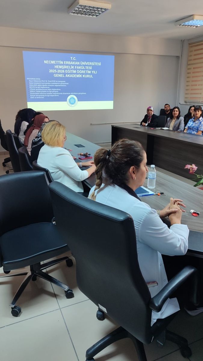 Fakültemiz Genel Akademik Kurul Toplantısı, 06.10.2025 tarihinde saat 11:30’da Hemşirelik Fakültesi dekanı Prof. Dr. Emel EGE, dekan yardımcıları Prof. Dr. Kamile ALTUNTUĞ, Doç. Dr. Serpil YÜKSEL ve öğretim elemanlarının katılımıyla gerçekleştirilmiştir. 2024-2025 eğitim-öğretim sürecinin değerlendirilmesi ile başlayan toplantıda KEYPS programı, YÖKAK akreditasyon hakkında bilgilendirmeler yapılmıştır. Öğrencilerin kariyer danışmanlığı ve 2209- A Üniversite Öğrencileri Araştırma Projeleri kapsamında desteklenmesinin önemine değinilmiştir. Sürdürülebilir kalkınma hedefleri doğrultusunda etkinliklerin planlanarak raporlanması hatırlatılmıştır. Toplantı akademik personelin görüş, öneri ve temennilerini iletmeleriyle sona ermiştir.