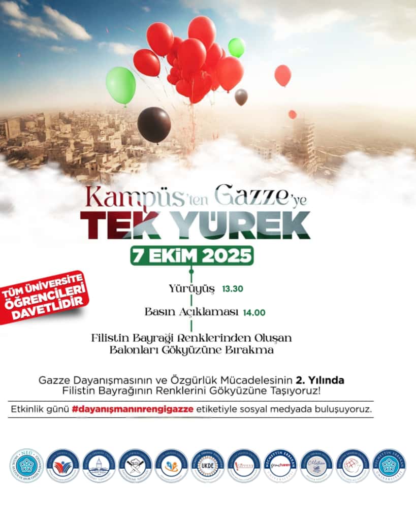 Fakültemiz dekanı Prof. Dr. Kamil GÜNEŞ'in 07/10/2025 Salı günü saat 13:30'da yapacağı açılış konumasıyla başlayacak olan "Kampüsten Gazze'ye Tek Yürek" yürüyüşüne tüm öğrencilerimiz davetlidir.