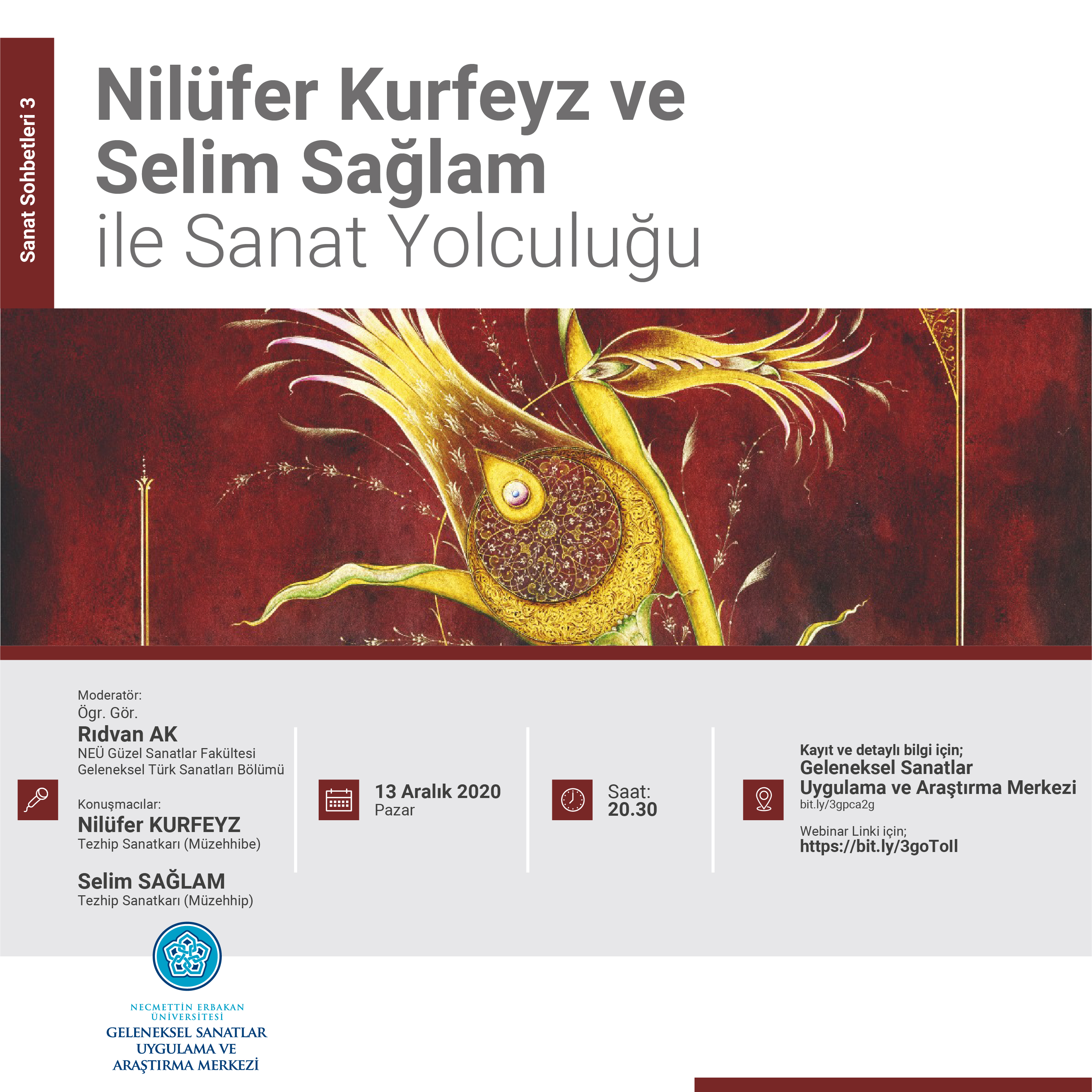 Programımızı 13 Aralık 2020 Saat:20:30' da "WEBİNAR" dan canlı olarak yapılacak programın Bu haftaki sohbet konusu "Nilüfer KURFEYZ ve Selim SAĞLAM ile Sanat Yolculuğu" Bölüm öğretim elemanlarımızdan Rıdvan AK hocamızın moderatörlüğünde