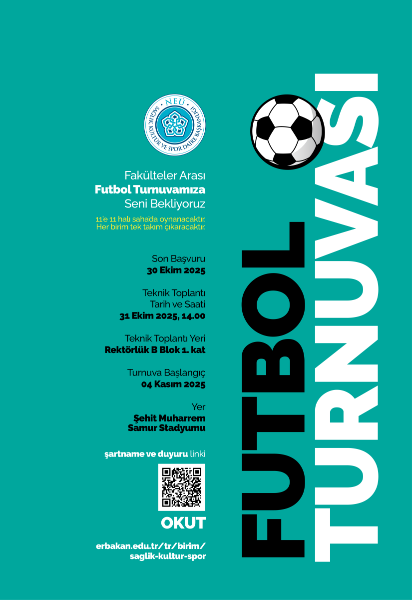 Necmettin Erbakan Üniversitesi Sağlık, Kültür ve Spor Daire Başkanlığı tarafından düzenlenen “NEÜ Öğrenci Futbol Turnuvası”, üniversitemiz öğrencileri arasındaki dostluk, kardeşlik ve takım ruhunu güçlendirmek amacıyla gerçekleştirilecektir.